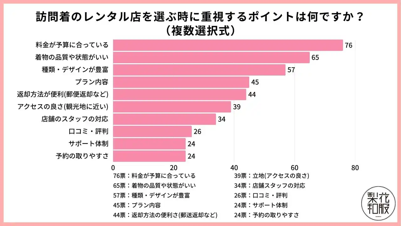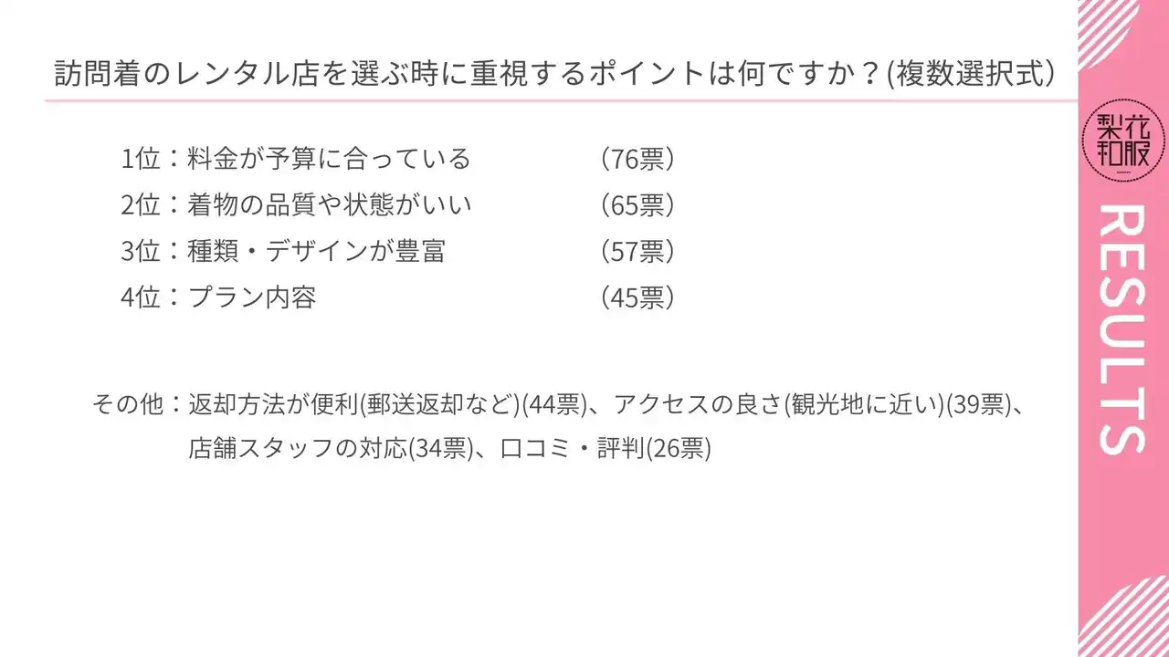 | 着物レンタル「梨花和服/花乃和服」を運営するTripFarm株式会社は、着物・訪問着を着用したことがある女性100名を対象に「訪問着をレンタルする上でのポイント」に関するアンケートを実施しました。 |