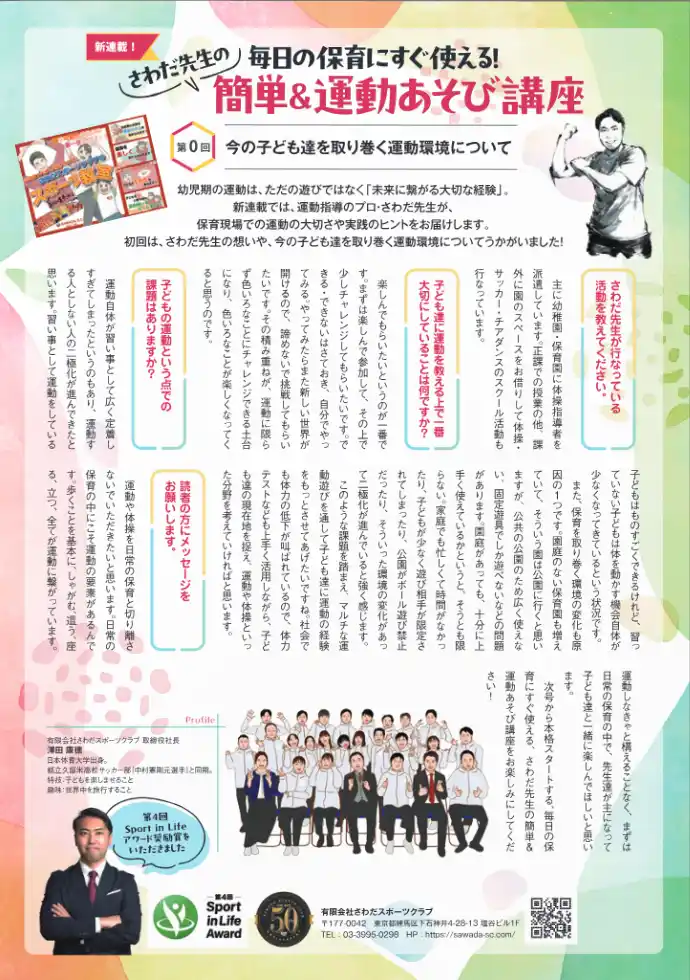 | 保育・幼児教育現場の“今”を支える研修会での監修実績に加え、専門誌『ミラクウ』での新連載も開始。子どもたちの笑顔と成長を応援する運動プログラムを全国へ発信してまいります。 | ||||||||||