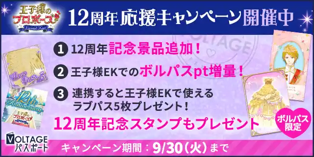 毎日の胸きゅんが貯まる!無料会員ポイントサイト「VOLTAGEパスポート」(以下、「ボルパス」)にて「王子様のプロポーズ Eternal Kiss」アニバーサリー応援キャンペーンを開催しております。この機会にぜひ「ボルパス」でもお得にお楽しみください。 |