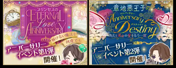 支えてくださったファンの皆様へ感謝を込めて、「王子様のプロポーズ Eternal Kiss」では“愛するプリンセスに、解けない魔法を”をテーマに、タイトル初のボイスドラマ販売のほか、アプリ内・外で様々なアニバーサリー企画を開催しております。この機会しか手に入らないアイテムを多数ご用意しておりますので、ぜひご注目ください。 |