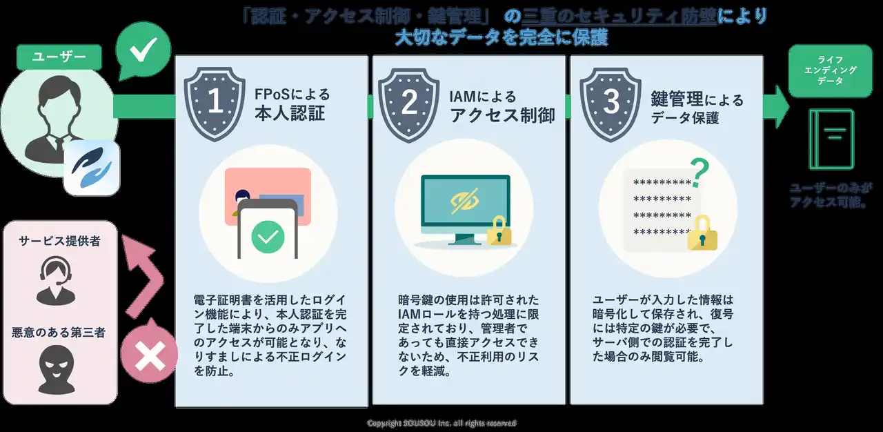 「SouSou」は、ご逝去後に必要な手続きをご家族等がスムーズに行えるよう、本人性が担保されたエンディング情報をあらかじめ記録しておけるアプリです。今回のアップデートでは、「三重のセキュリティ構造(本人認証・アクセス制御・鍵管理)」を導入し、全方向的に情報を守る仕組みを実現しました。 |