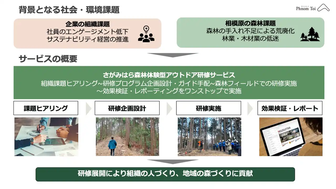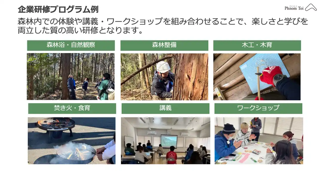 株式会社プノントイでは、さがみ湖MORI MORI様とともに、森林を活かした研修事業をこの度本格的にスタートすることとなりました。この事業により、森林・里山空間が人々の健康で心豊かな生活や、企業の持続可能な経営においても重要であることが社会的に認知され、森林・里山を次世代に繋いでいく"関わり手"を増やしていくことに貢献していきます。 |