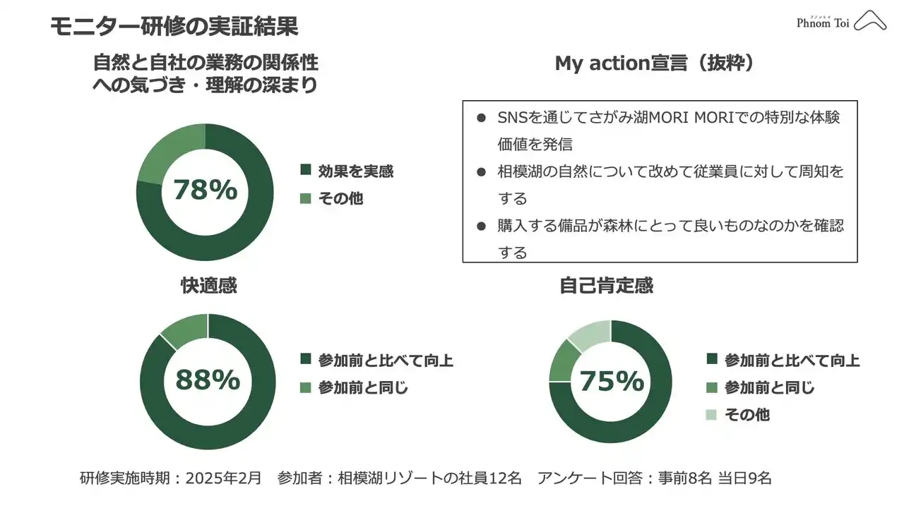 こうした企業と地域の課題に応えるべく、株式会社プノントイは、相模原市内で85haの森林を有するリゾート施設 さがみ湖MORI MORIと協力し、森林の力を活かした研修サービスを開発しました。モニター研修では、非日常の自然体験を通じて以下の効果が確認されています。 |