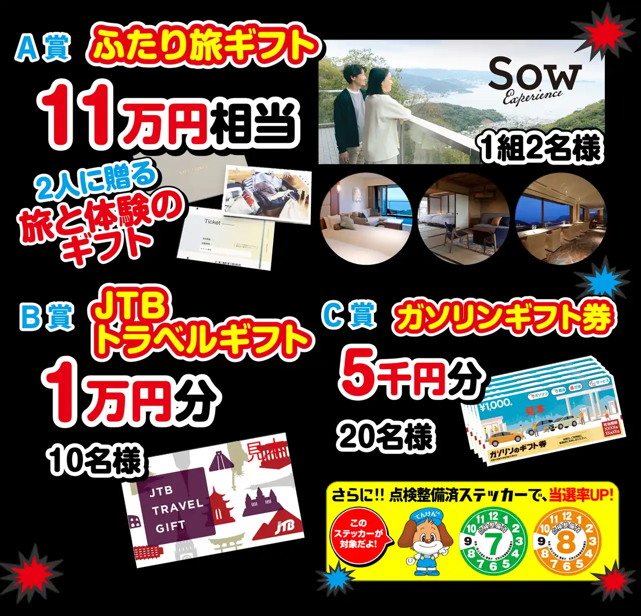 | ・A賞 SOW EXPERIENCE ふたり旅ギフト11万円相当 1組2名様 | ||||||||||