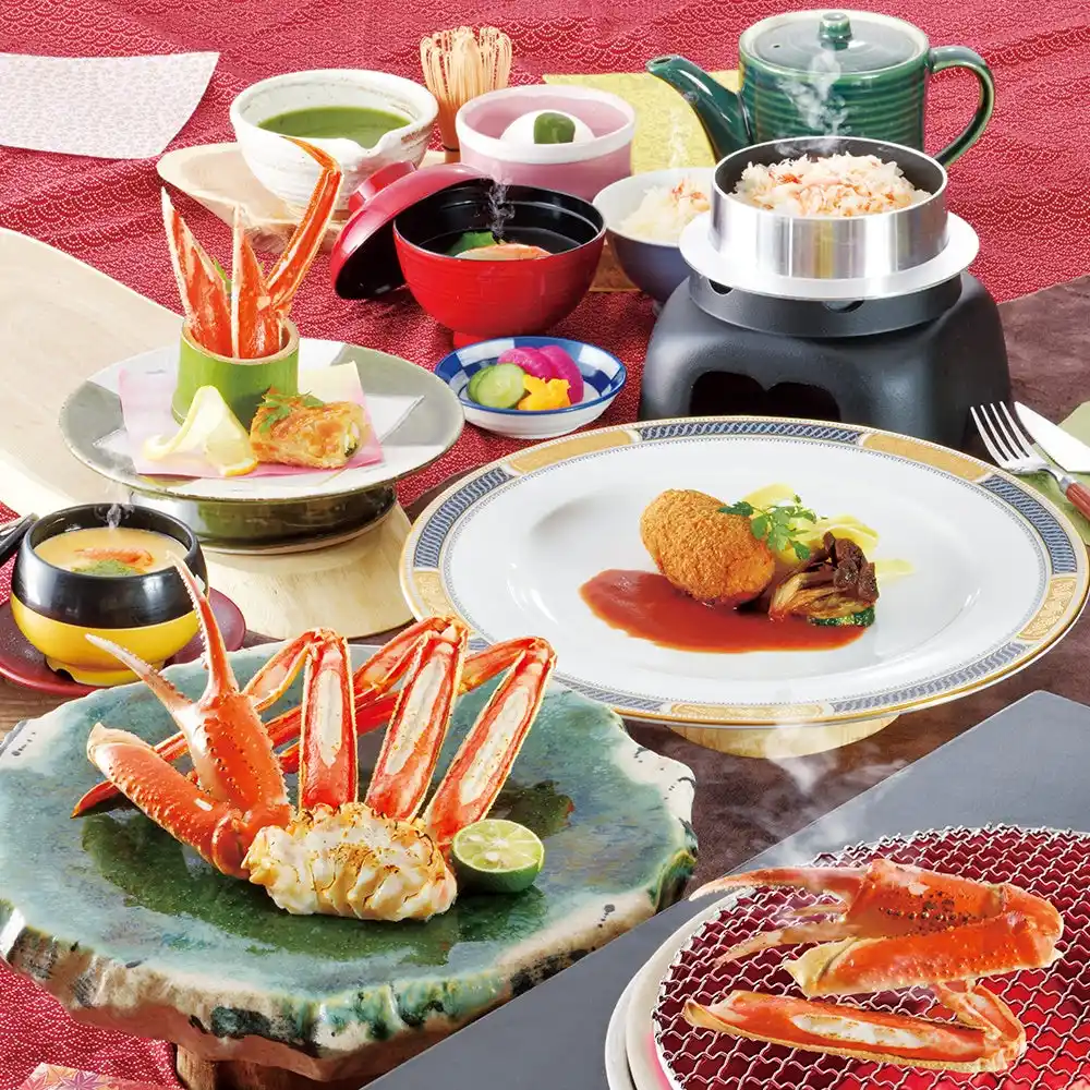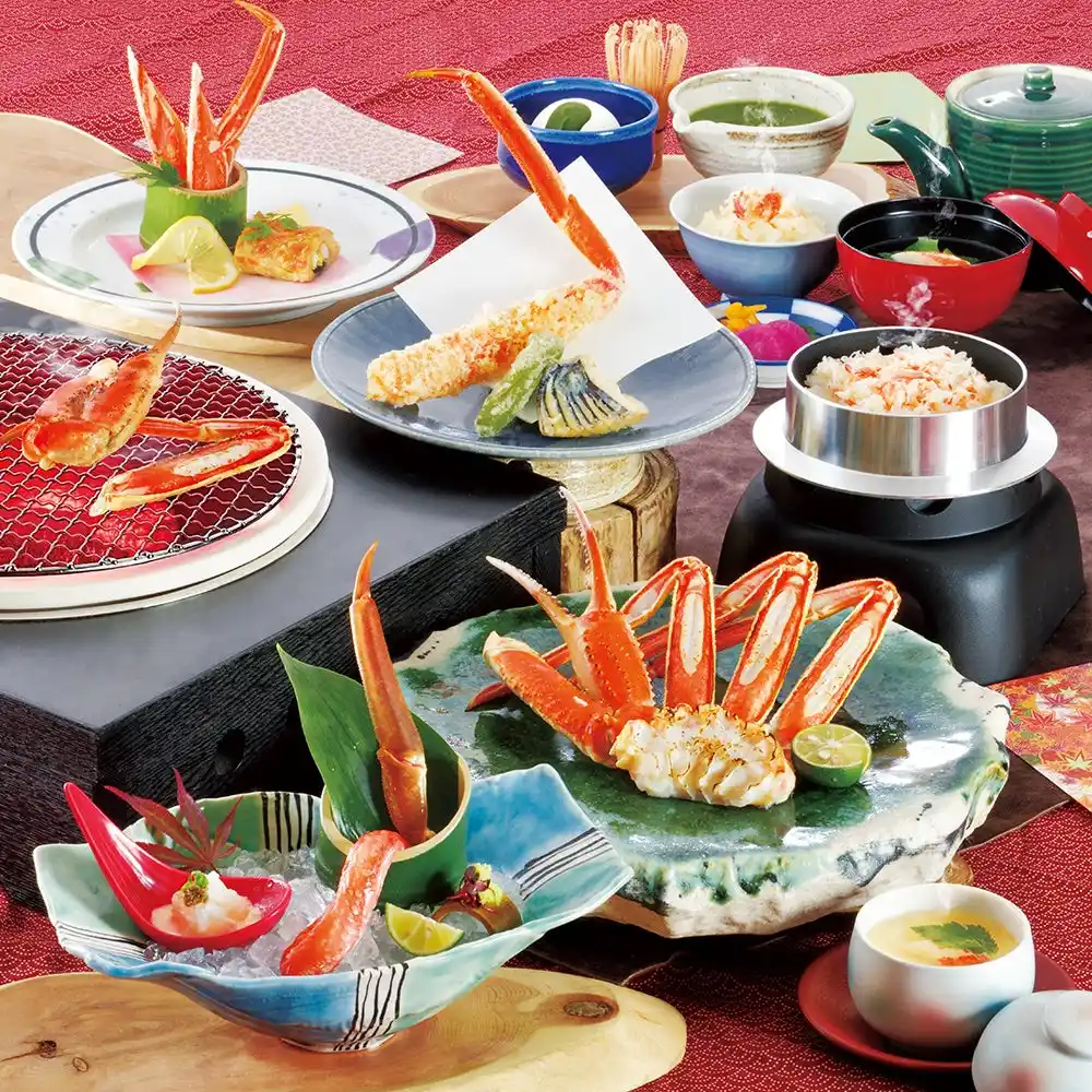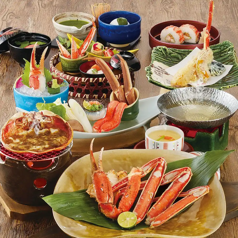 ◆前菜(・かに酢・かにつみれ椀・かにの湯葉巻きサラダ かにみそドレッシング)◆かに爪霜降り造り ◆かに茶碗蒸し◆ズワイかに半身焼◆厳選ズワイかに かにみそ甲羅焼◆かにしゃぶ小鍋◆かに特大天ぷら ◆道楽巻◆汁物◆アイスクリーム お抹茶かけ※西日本地区全店舗でご利用いただけます。 |