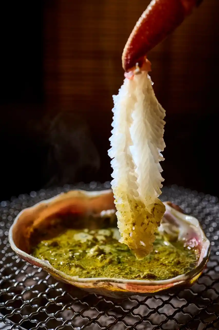 かかにみそ甲羅焼だけではなく、かに身をくぐらせることでジューシーなかに身とクリーミーで濃厚なかにみその饗宴がお楽しみいただけます。焼き上げたかにの身を、熱々のかにみそにくぐらせて、炙りの香りと共に口に広がる旨味の重奏はまさに芸術とも言えます。さらに焼いたかに身をほぐして軽く混ぜればかにみそのグラタンのような贅沢な味わいに。 |