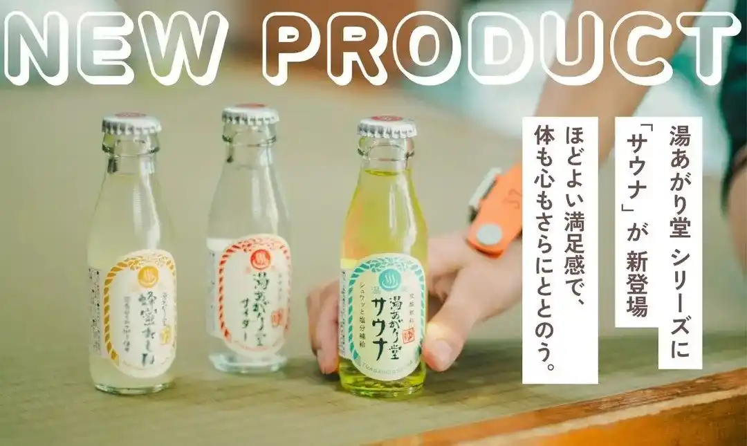 「湯あがり堂サウナ」は飲みきりサイズの炭酸飲料。エナジードリンク風味にほんのり塩味が効いており、サウナ後の“ととのう”をサポートします。 |