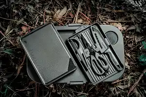 まな板、調理用ナイフ、キッチンバサミ、ピーラーの4点セット。コンパクトに収納可能な設計で、軽量で持ち運びに便利なことも特徴です。 |