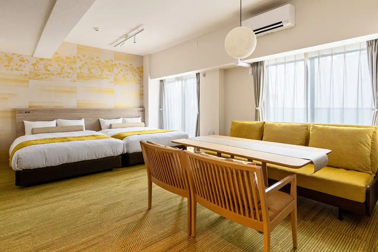 冷蔵庫・オーブンレンジ・洗濯機などの家電、テーブルやソファなどの家具、調理器具や食器・カトラリーを含めたアメニティを備えており、住宅のように暮らせる快適な客室空間(全18室:約27.50平方メートル [定員4名]~ 40.10平方メートル [定員6名])となっています。 |