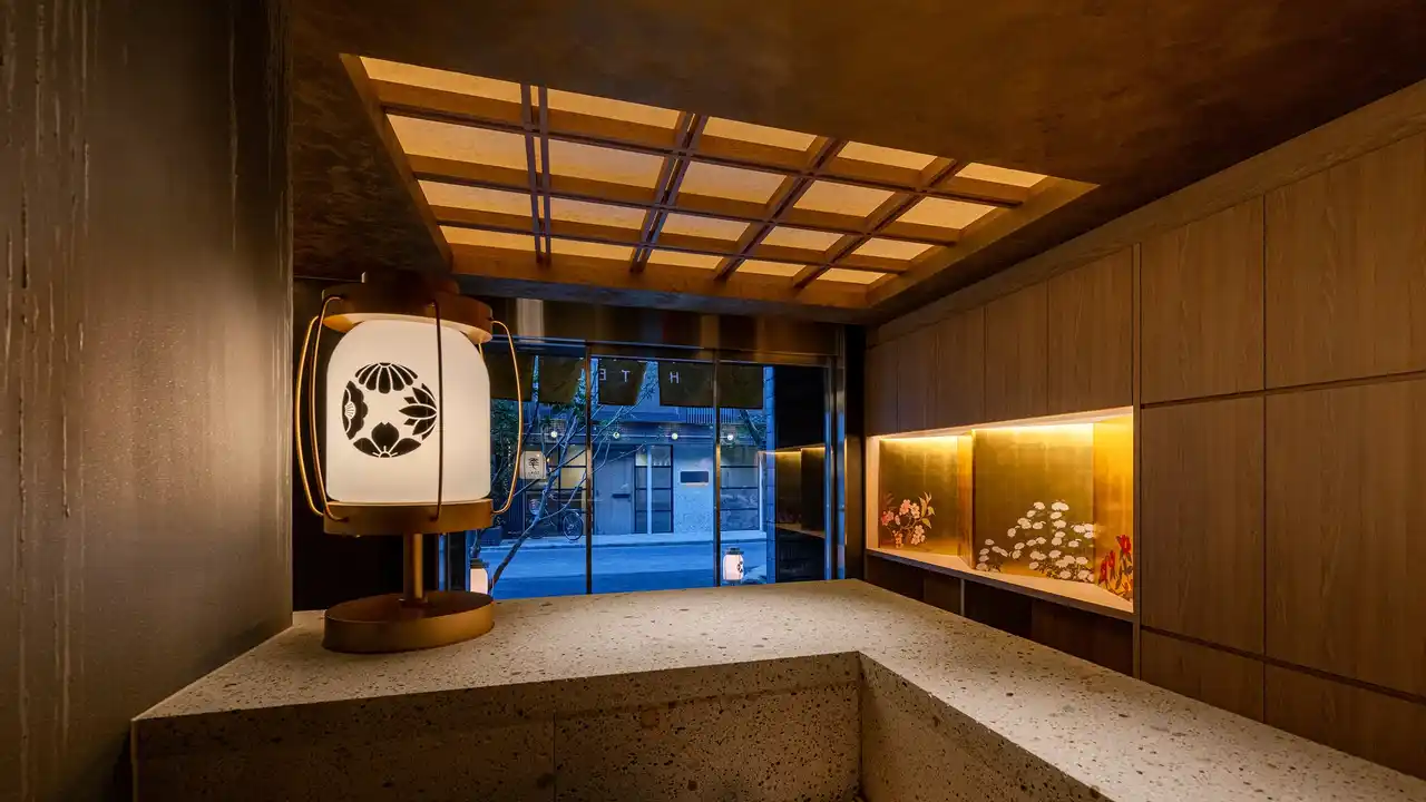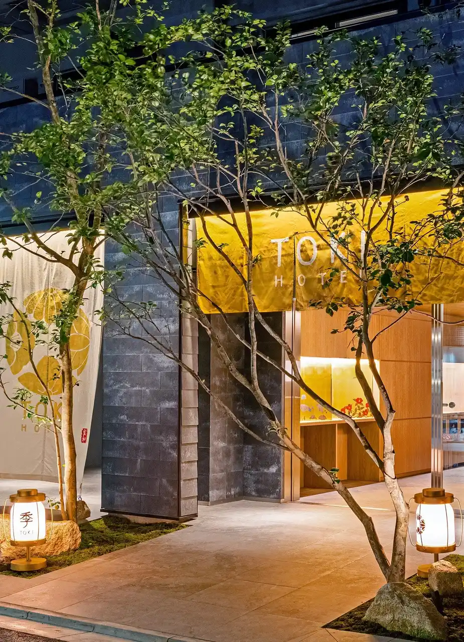 お客様をお出迎えするのは、暖簾や提灯、椿の木を配した和庭。和の色目や風合い、佇まいからも、和の美意識を感じながら、「HOTEL TOKI 季」での心和む時間をお過ごしください。 |