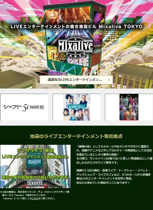 また、上記2ホールのコンテンツだけではなく、全施設のイベント情報、池袋駅からのアクセス動画などなど、この動画を見て触っていくだけで「Mixalive TOKYO」 の全てが分かるコンテンツになっています。 |