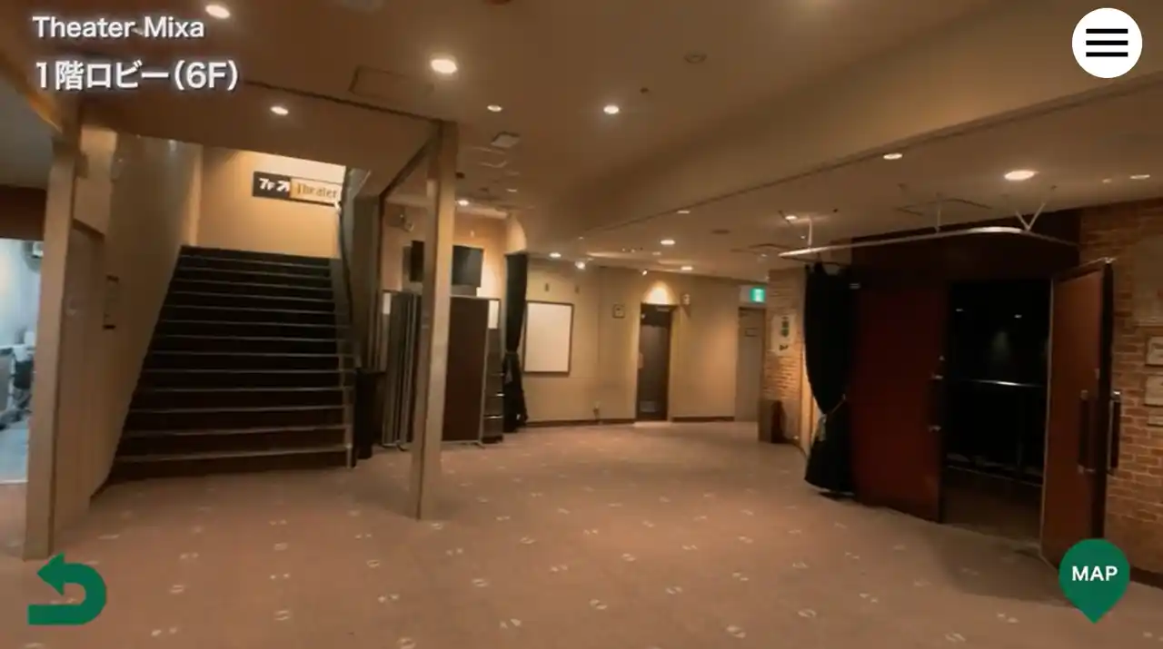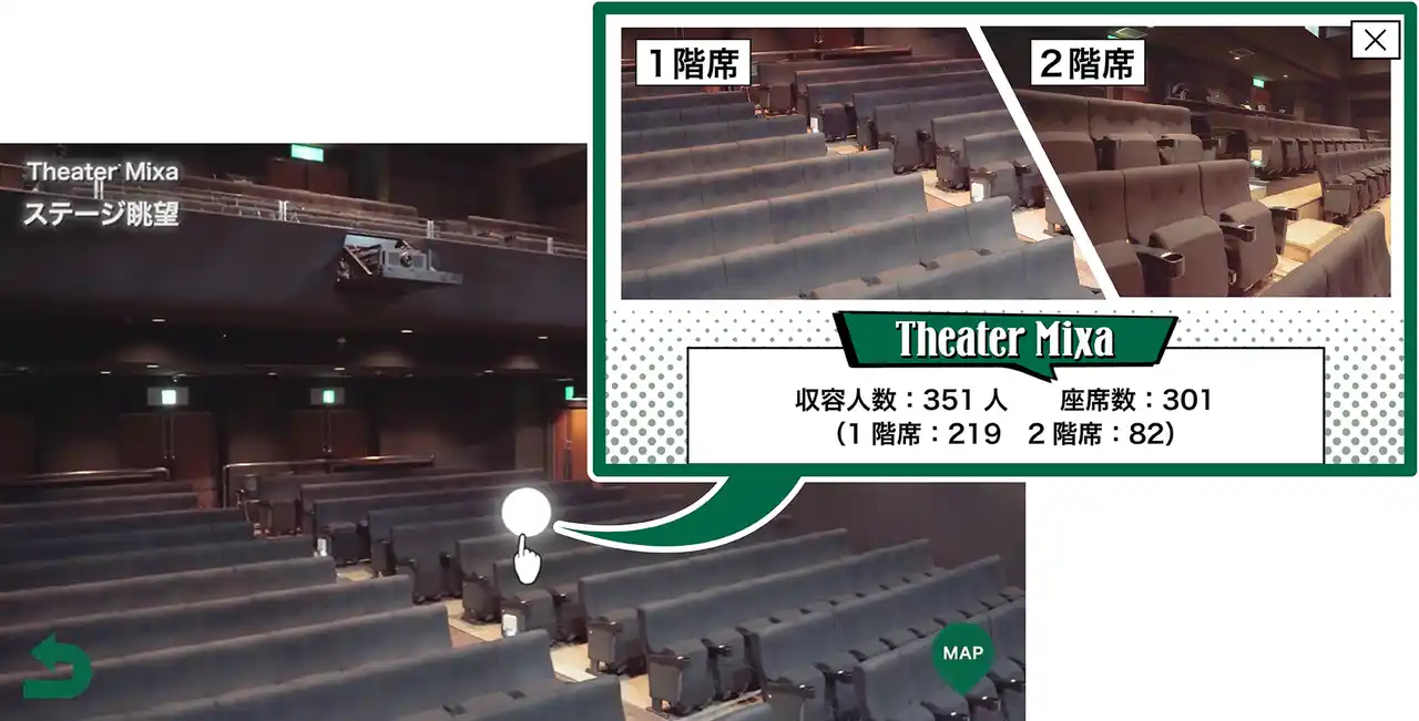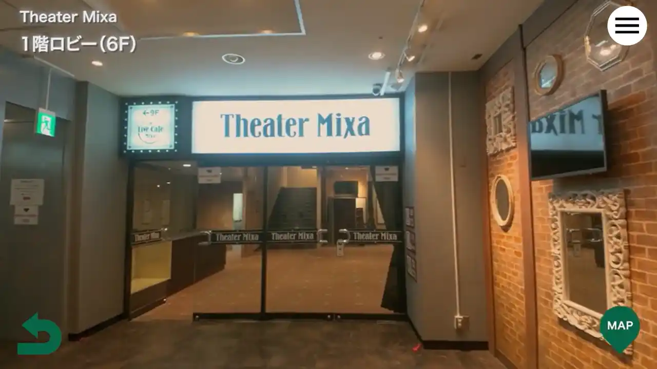 今回、 「Mixalive TOKYO」 公式サイトに実装されたtacmoは、ラストイヤーキャンペーン対象の「Theater Mixa」「Hall Mixa」の施設内に入り込み、主観アイで内覧(疑似体験)できるのが最大の特徴。内覧できるだけではなく、途中に現れるマークをクリックすると施設の情報が表示されます。 |