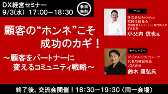 | 会員サイトOPENを記念し、DX経営セミナーを開催します。ゲストに株式会社Asobica 取締役副社長で情報経営イノベーション専門職大学 客員教授の小父内信也氏をお招きし、日本オムニチャネル協会 会長の鈴木 康弘氏との対談セミナーを実施します。 | |||