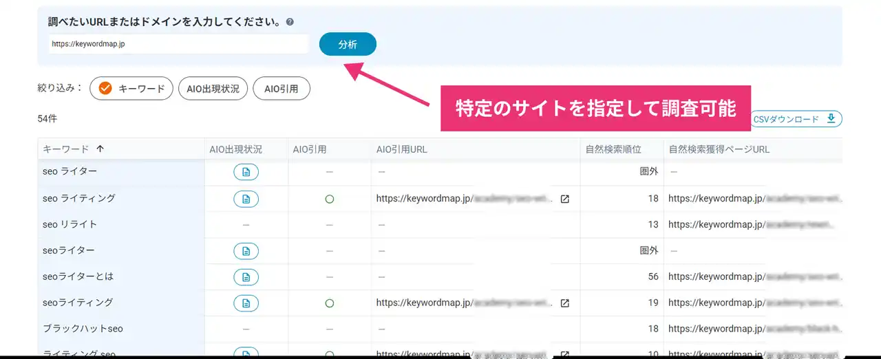 「AIO出現レポート」とはAI Overviewsの表示有無、回答内容、引用URLの情報を取得できる分析機能です。 |