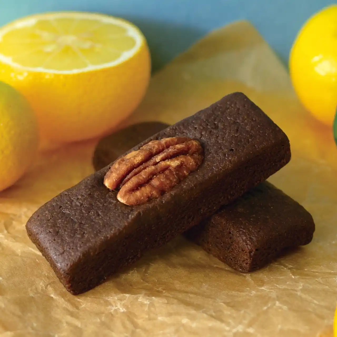 「湘南ゴールドブラウニー」は、ダークチョコレートのブラウニー生地に、丁寧に剥いて粗く刻んだ湯河原産の希少柑橘“湘南ゴールド”の皮を混ぜてじっくり焼き上げた逸品です。上品で爽やかな香りがそのままお口いっぱいに広がります。上には、アクセントとしてブラウニーの心地よい食感を引き立てるピーカンナッツをトッピングしました。 |