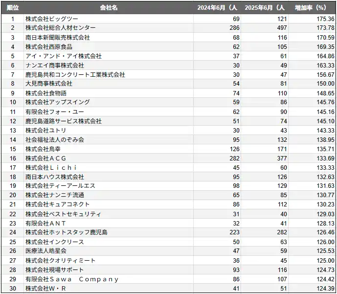 株式会社SalesNow(本社:東京都渋谷区、代表取締役:村岡功規、以下「当社」)は、国内540万社の企業情報を完全網羅した日本最大級のデータベース「SalesNow DB」より、人口の多い上位30都市を対象とした「従業員数増加率ランキング」を発表しました。本リリースでは、各都市別のデータをもとに、今回は「鹿児島市に本社を置く企業」を対象に、従業員数の増加傾向にフォーカスします。