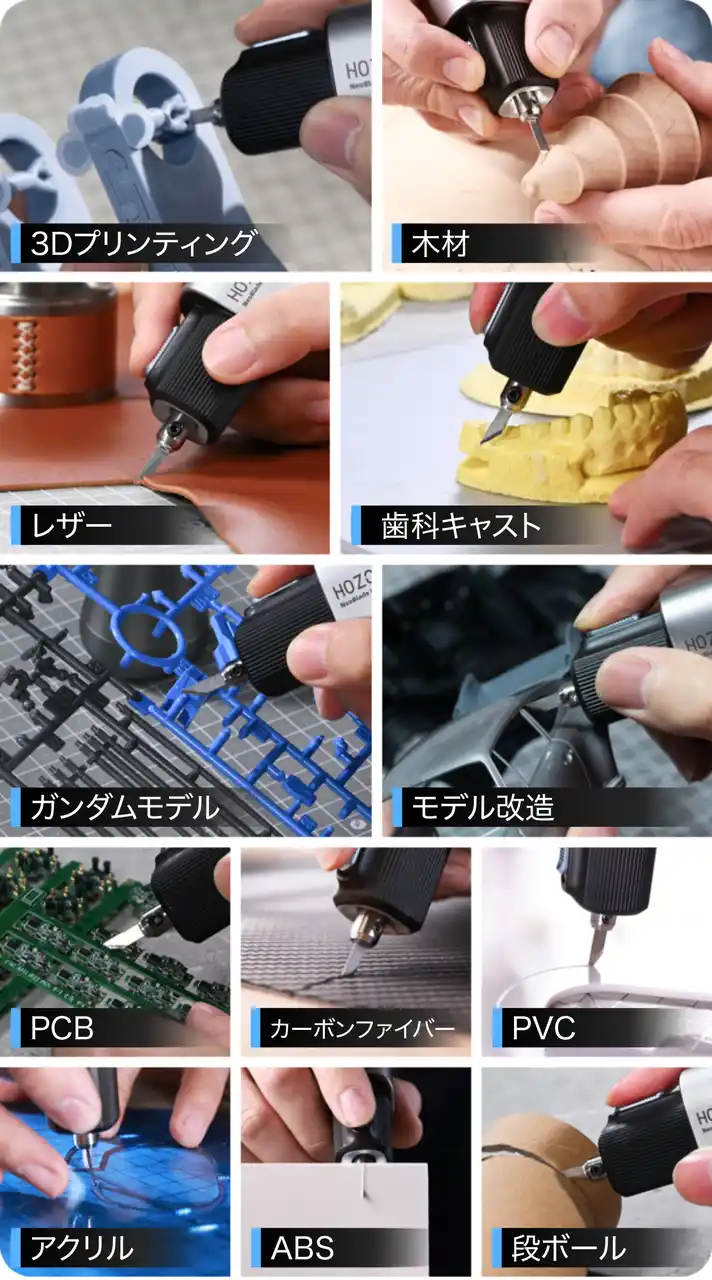 3Dプリント部品の整形、電子基盤の加工、革素材のステンシルや発泡スチロールなどの繊細な造形まで用途は自在です。 |