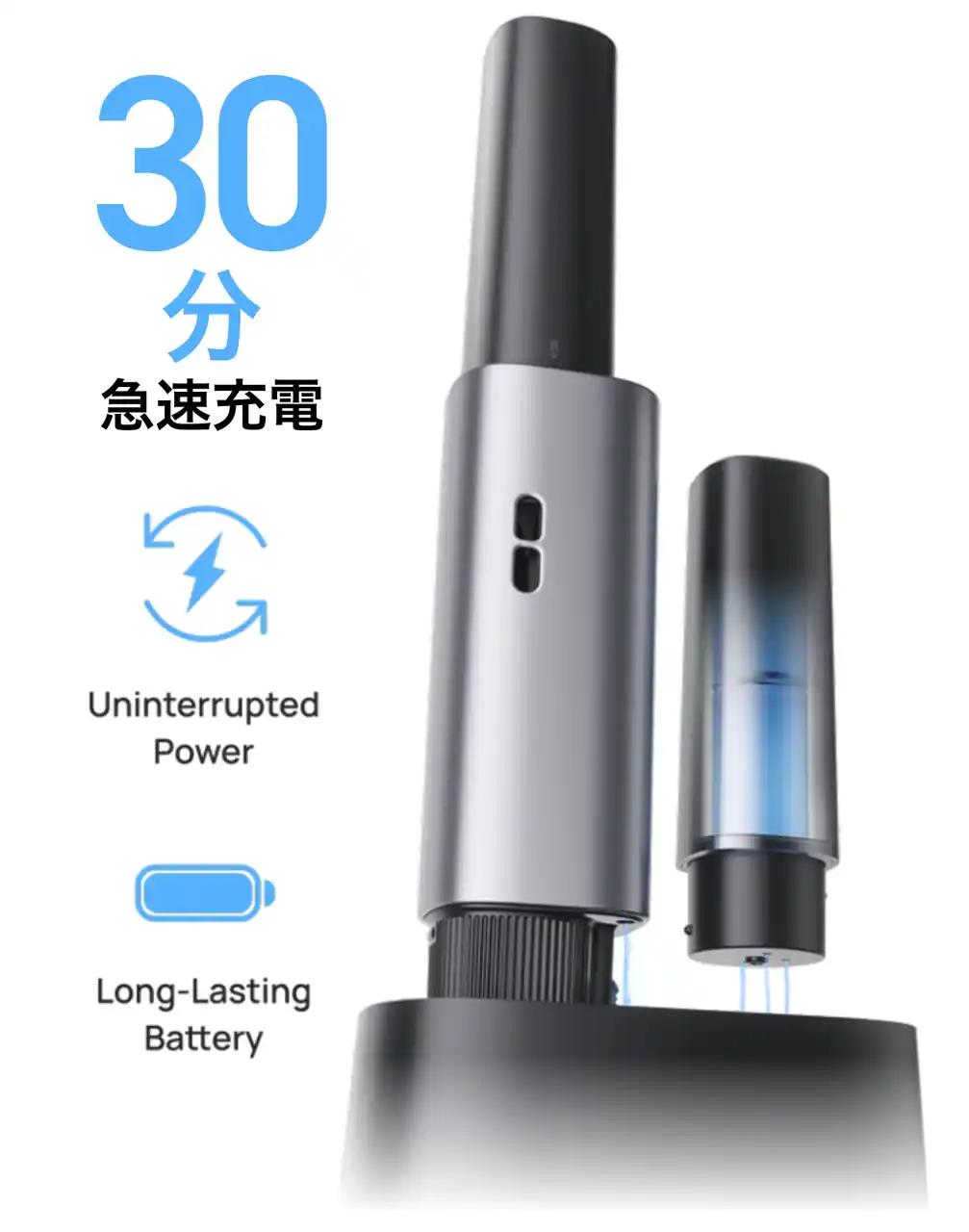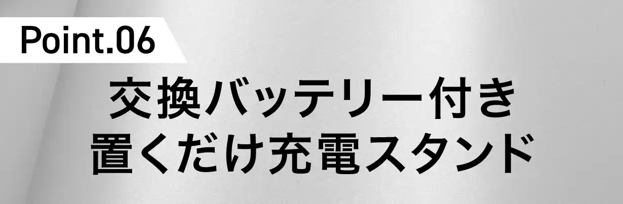 NeoBladeには交換式のバッテリーが2本付属。片方を使いながら、もう一方を充電できるため、作業中に「電池切れで止まる」ことがありません。バッテリーはわずか3秒で着脱できるスライド式。さらに本体をスタンドに置くだけで自動で充電が始まる「置くだけ充電スタンド」を採用。 |