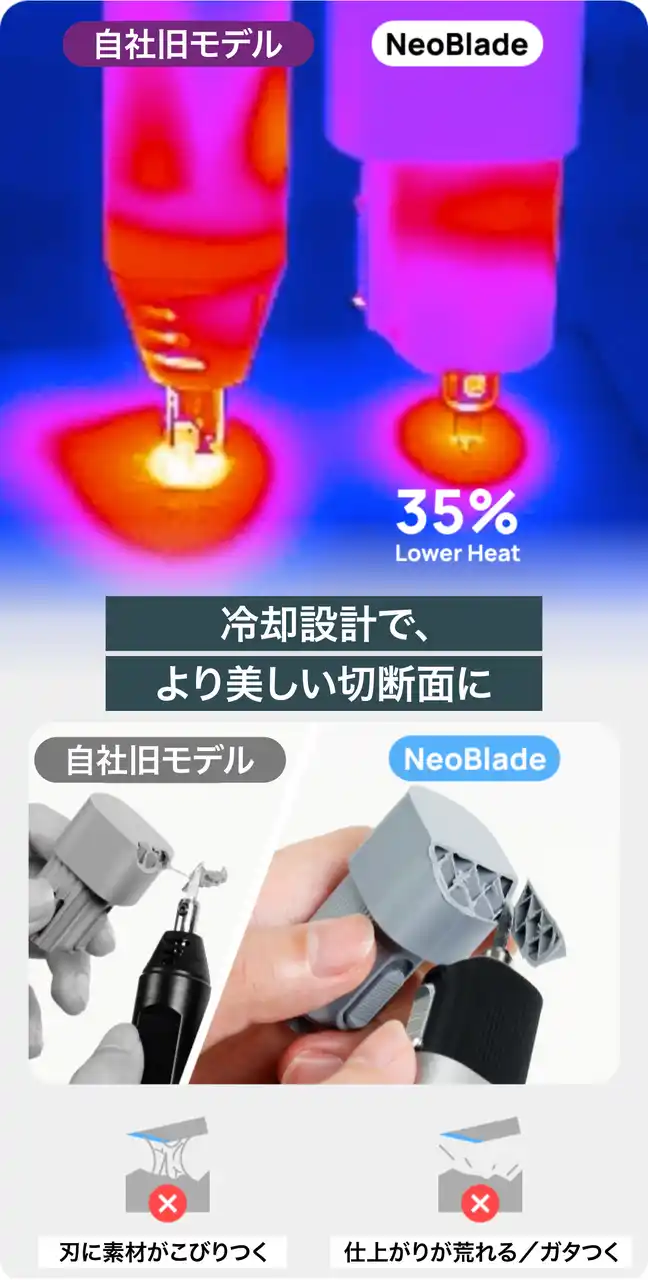 刃の発熱を抑えることで、バリや白化の原因となる熱変形を軽減。熱画像比較でも、他製品と比べて最大35%の低温を実現しています。 |