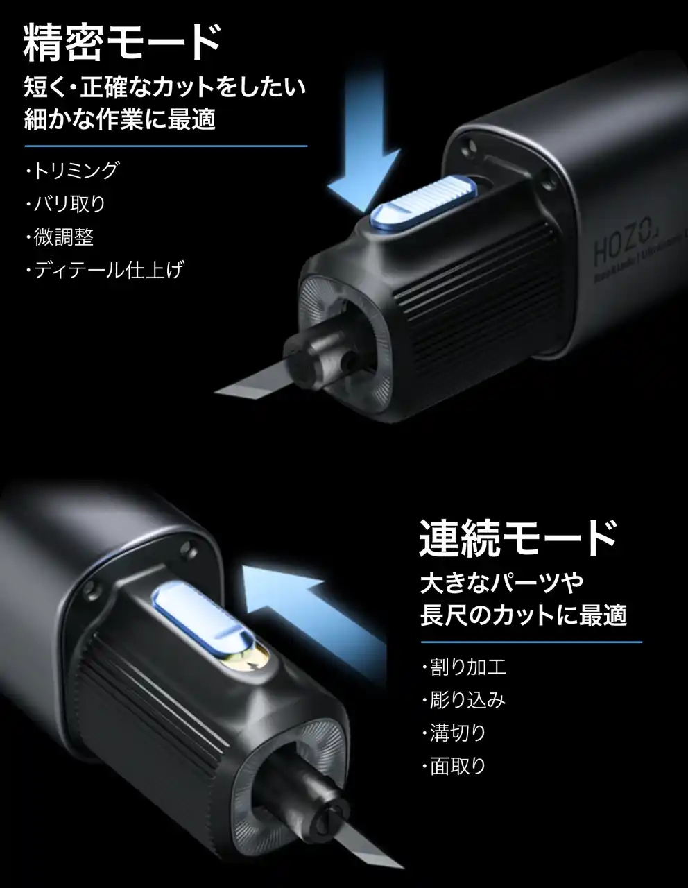 作業に合わせて切れ味もコントロール。NeoBladeは連続振動の「通常モード」と断続振動の「パルスモード」を切り替え可能。厚みのある素材も細部の微調整も、これ一台で対応できます。 |
