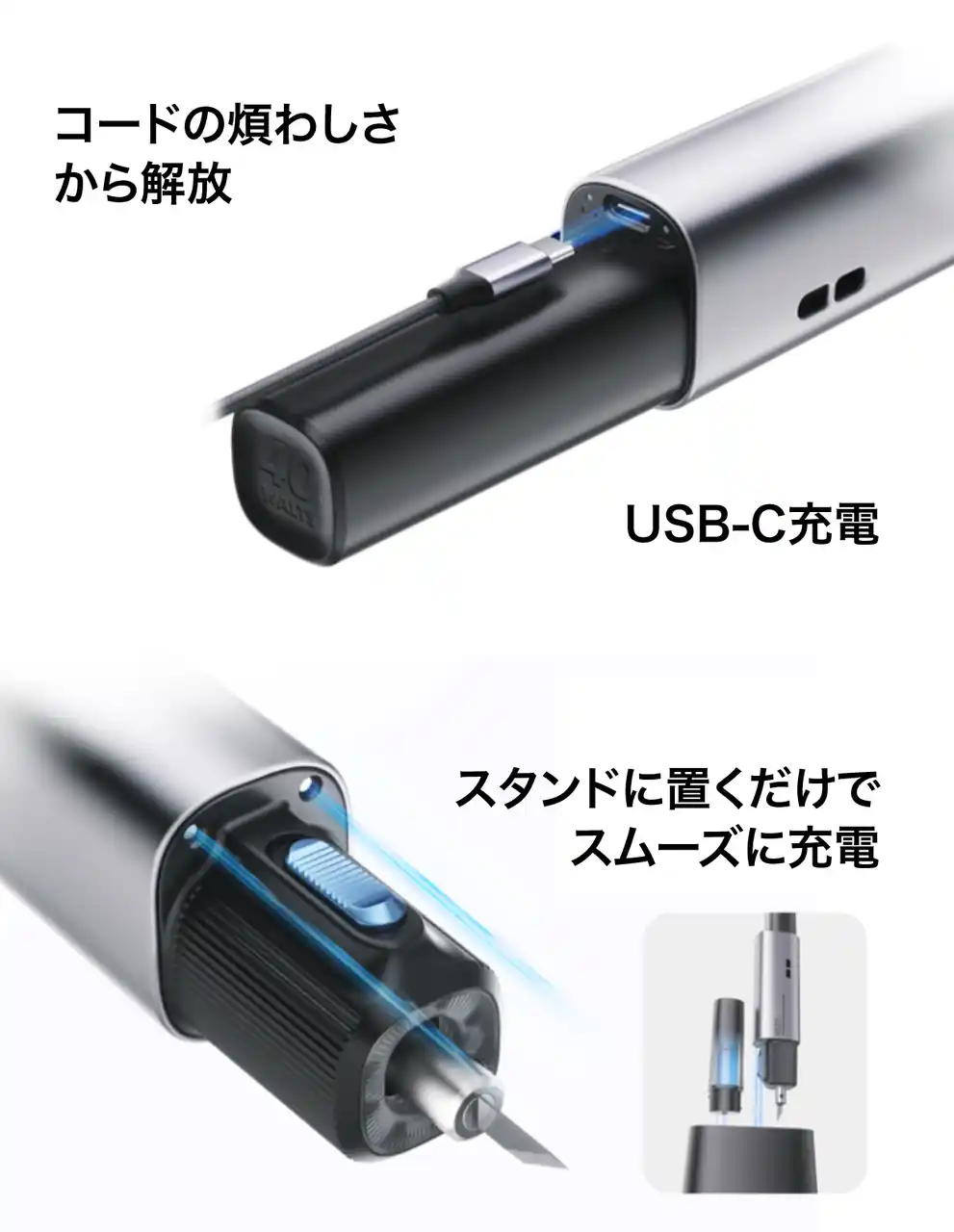 NeoBladeは本体に直接USB-Cケーブルを挿すだけで充電できます。タブレットやスマホと同じ規格なので専用ケーブルを持ち歩かなくても汎用性の高い充電環境で対応できます。 |
