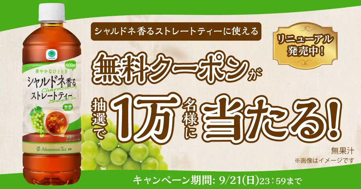 ファミリーマート公式X(@famima_now)をフォローのうえ、ファミリーマート公式Xからの対象の投稿に「#ファミマル」とつけてリプライいただくと、抽選で10,000名さまに「シャルドネ香るストレートティー」の無料クーポンが当たります。 |
