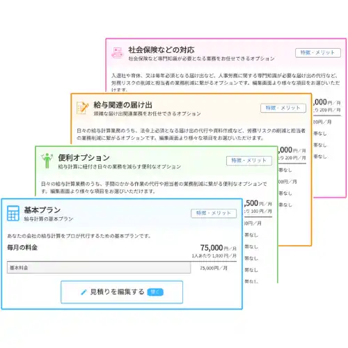 必要なオプションをご自身でON/OFFするたびに、料金がリアルタイムで変動します。サービス内容と価格の関係性、ひいては給与計算業務の構造そのものが明確に可視化されます。 これにより、お客様は深く納得した上で、自社に最適なプランを主体的に設計できます。 |