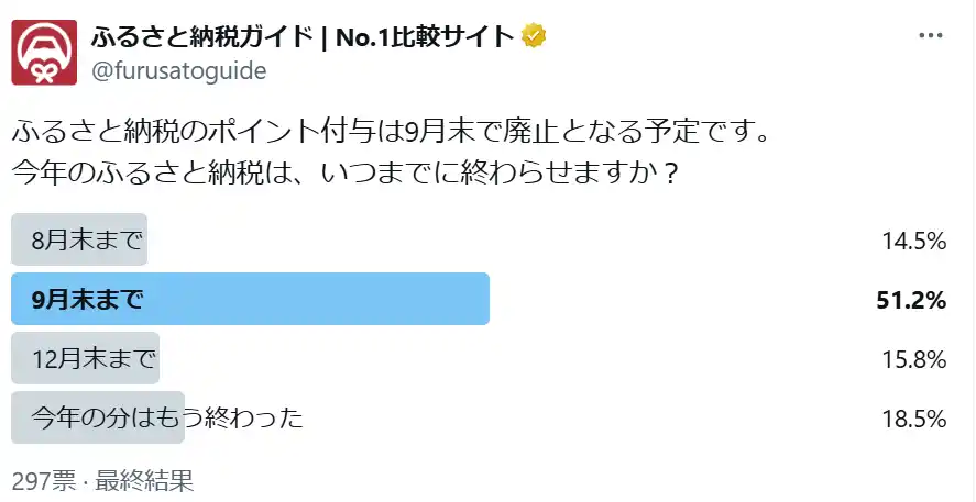 2025年8月11日~8月14日に「ふるさと納税ガイド」X公式アカウント @furusatoguide で行ったアンケートでは、合計で約84%の方が9月末までに今年のふるさと納税を終わらせる(もしくは終わらせた)意向を持っていると回答しました(※)。 |