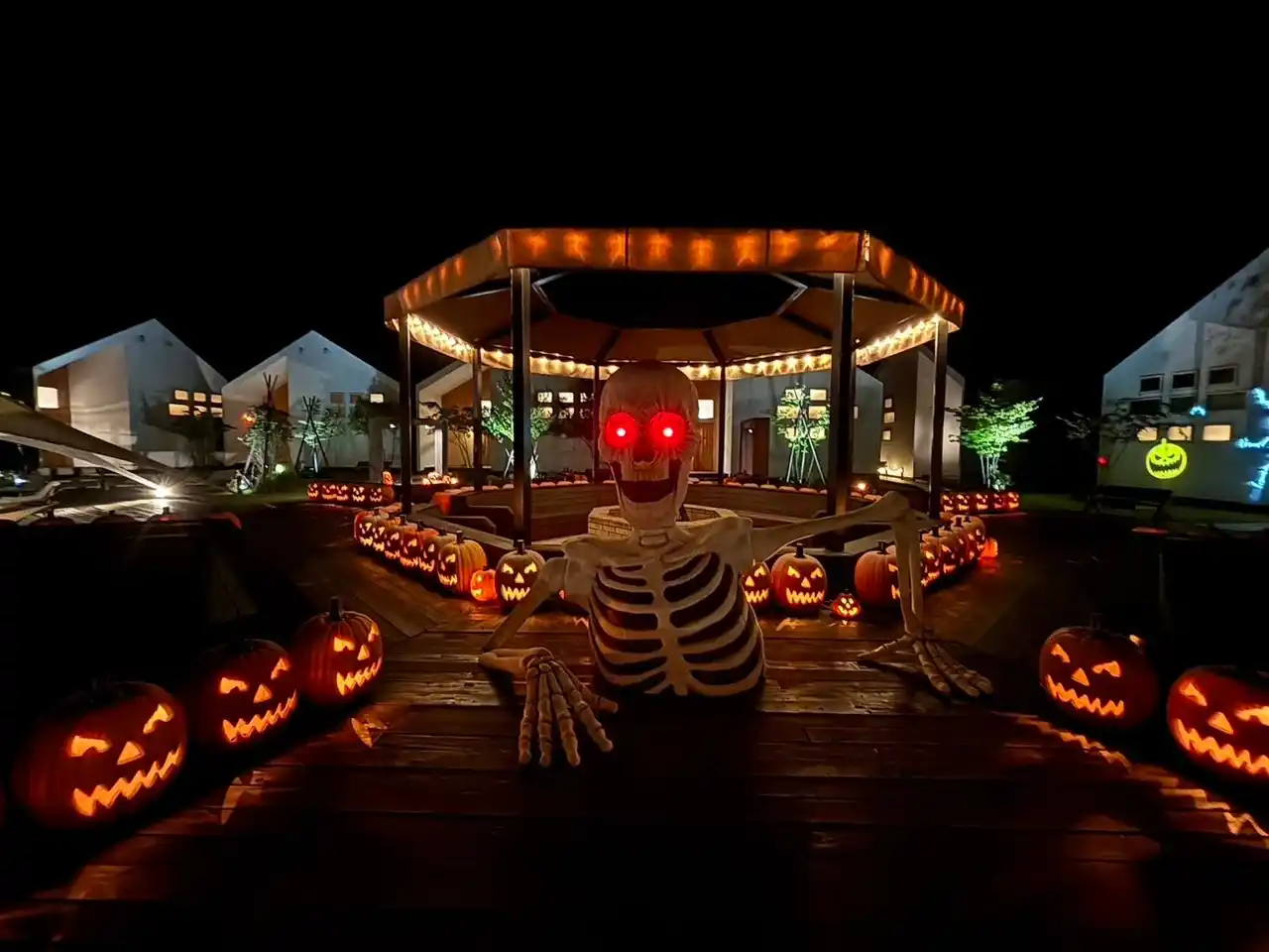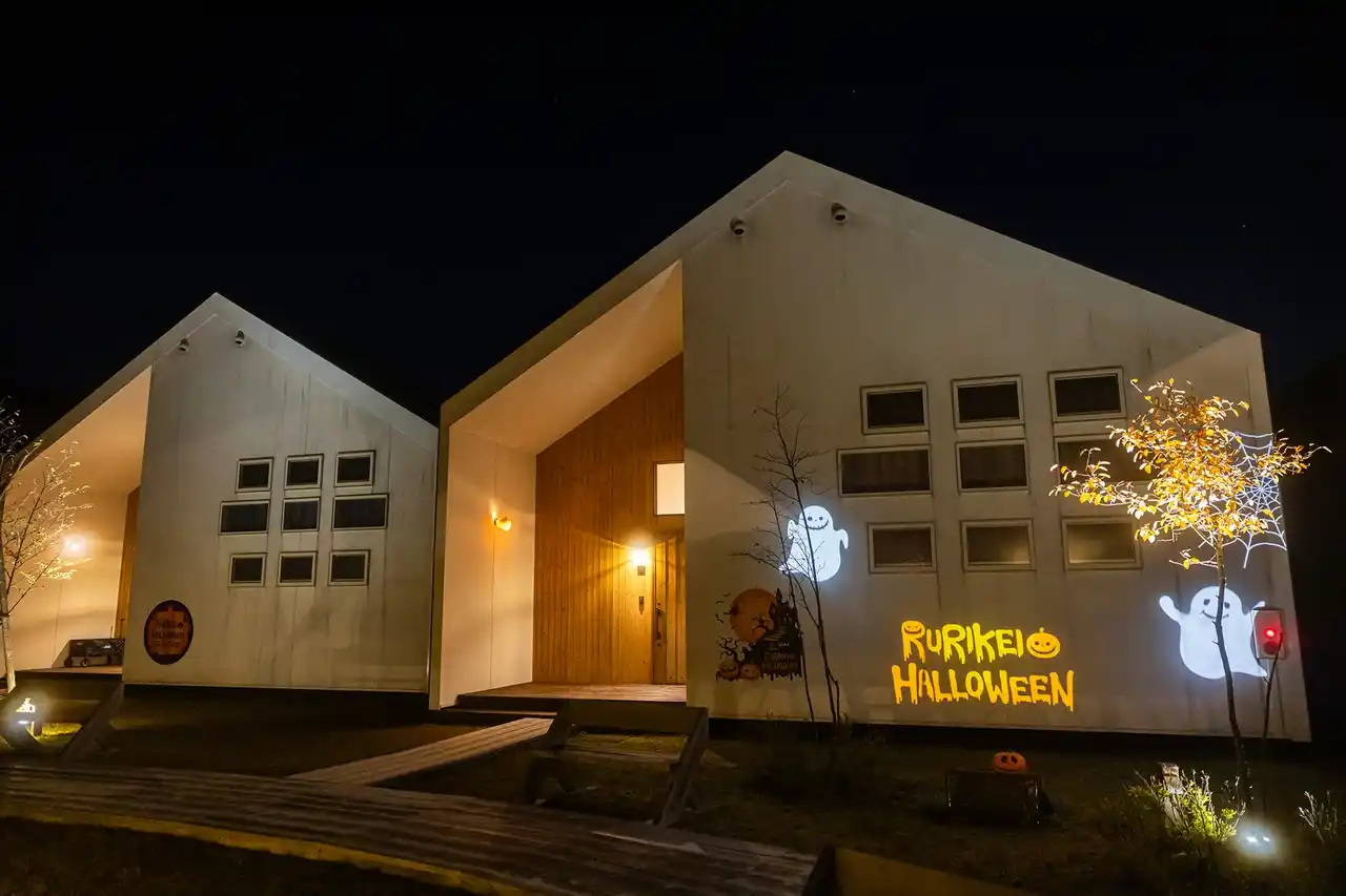 また、GRAXやGRAX HANARE では、夜になると光るたくさんのジャック・オー・ランタンやハロウィン限定のプロジェクションマッピングが施設全体を彩ります。ご家族やご友人と、るり渓ハロウィンの世界をお楽しみください。 |