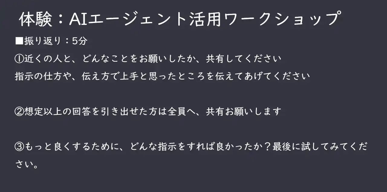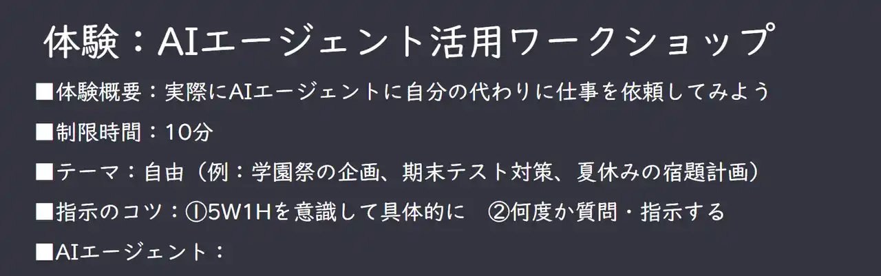 | 続いて「京都への修学旅行計画」を題材にしたデモを実施し、AIが思考と行動を繰り返して計画書を作成する過程を体験いただきました。その後は、学生のみなさま自身が「学園祭の企画」や「夏休みの宿題計画」など自由なテーマを設定してAIに依頼し、近くの参加者同士で成果を共有しました。最後には「どんな指示をすればより良い結果につながるか」を考えて再度AIに試す振り返りを行い、指示の仕方で結果が変わることを実感していただきました。この体験を通じて、学生のみなさまがAIとの対話の楽しさやコツを学ぶ姿が見られました。 | |||||||||