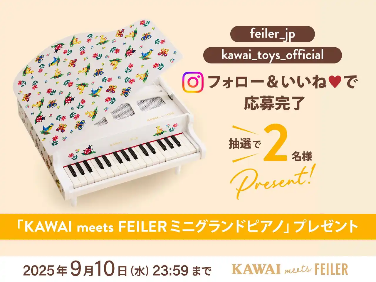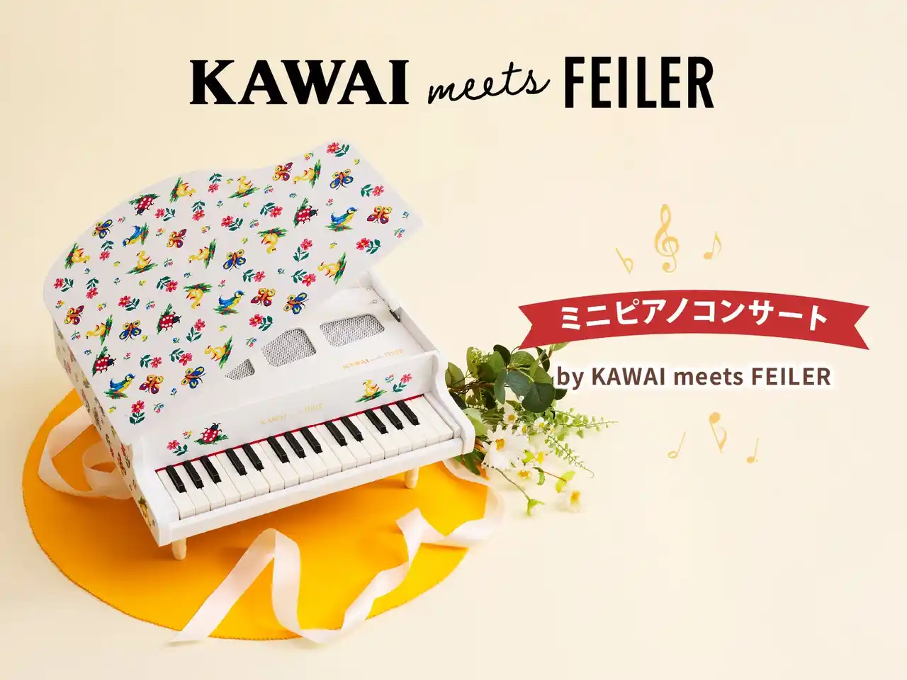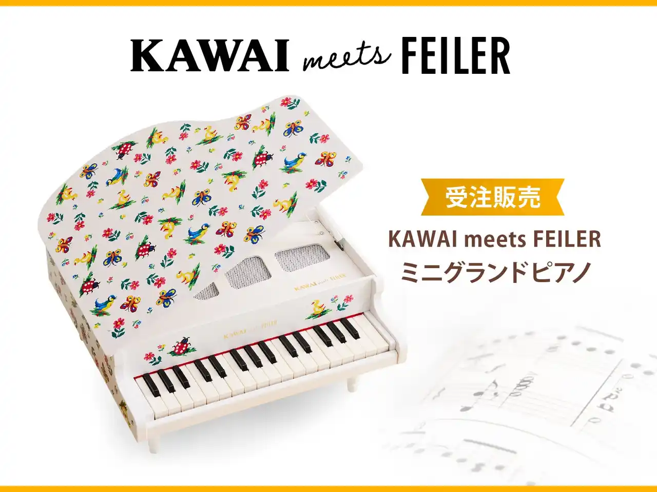 フェイラージャパン株式会社(本社:東京都渋谷区、代表取締役社長:八木直久)は、株式会社河合楽器製作所(本社:静岡県浜松市、代表取締役社長:河合健太郎)とのコラボレーション「KAWAI meets FEILER」により製作したミニピアノをフェイラー銀座本店、カワイミニピアノ公式オンラインショップ、カワイ直営店にて、オリジナルデザインのハンカチをフェイラー銀座本店、高島屋大阪店フェイラーショップ、フェイラー天神地下街店、カワイミニピアノ公式オンラインショップにて限定販売することを発表いたします。ミニピアノは受注販売、ハンカチは抽選販売となります。 |