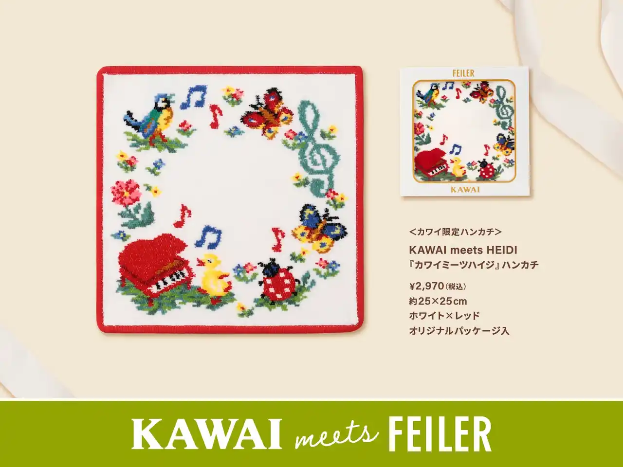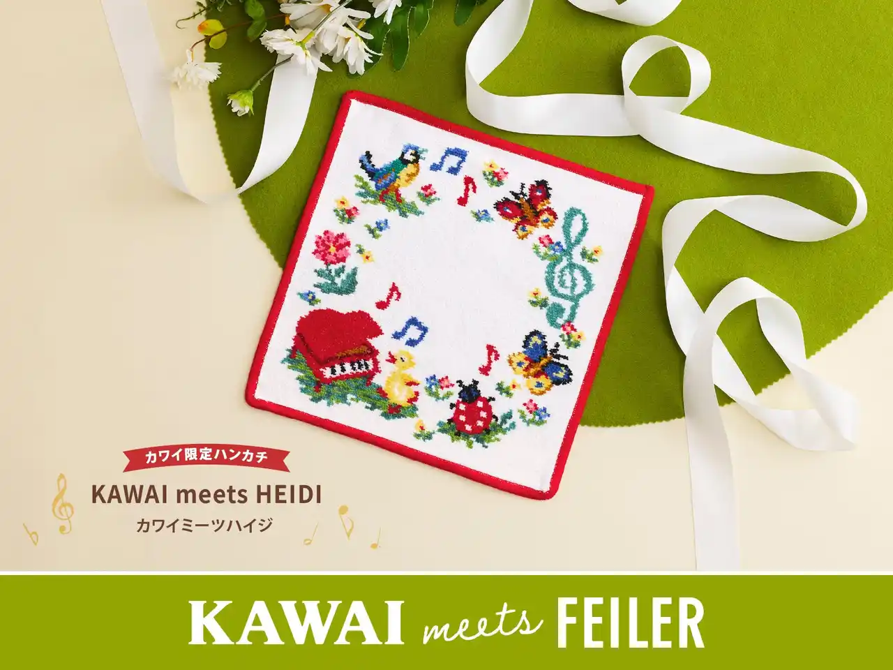 「KAWAI meets FEILER ミニグランドピアノ」と「KAWAI meets HEIDI ハンカチ(ホワイト×レッド)」の両方を一度にお楽しみいただけるプレミアムセットを、数量限定で100セット販売いたします。¥68,970(税込) |