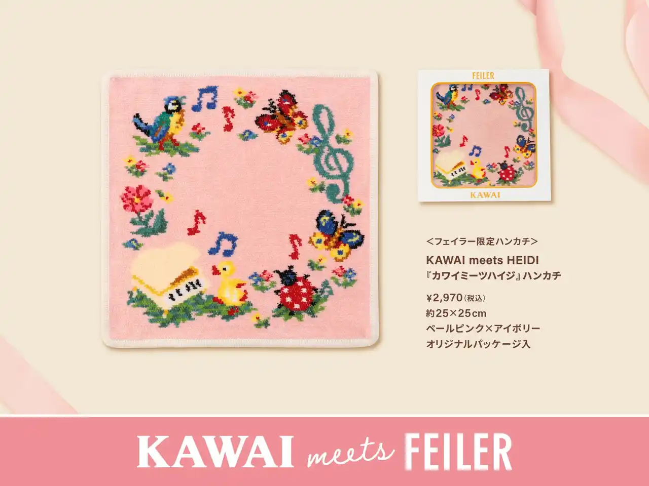 「感性の駆動」を通して、多くのひとの人生に彩りを届けたいという願いを込めたフェイラーのブランドメッセージ「心はいつだって踊れる。」に、カワイのミッションである「人生を、響かせる。」が共鳴してコラボレーションが実現しました。今回のコラボレーションでは、お子さまから大人まで、幅広い世代に愛されているフェイラーの人気デザイン『HEIDI(ハイジ)』がカワイのミニピアノを彩り、フェイラーのハンカチには、カワイのミニピアノが愛らしいモチーフとして登場いたします。 |
