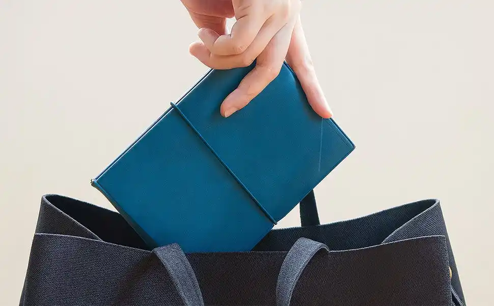 大きく書き込めるのに、持ち運びはスマホ感覚のコンパクトさ。独自の構造で作られた柔らかなPVCのカバーは、ハンカチのように折り畳むことができます。(特許取得済) |