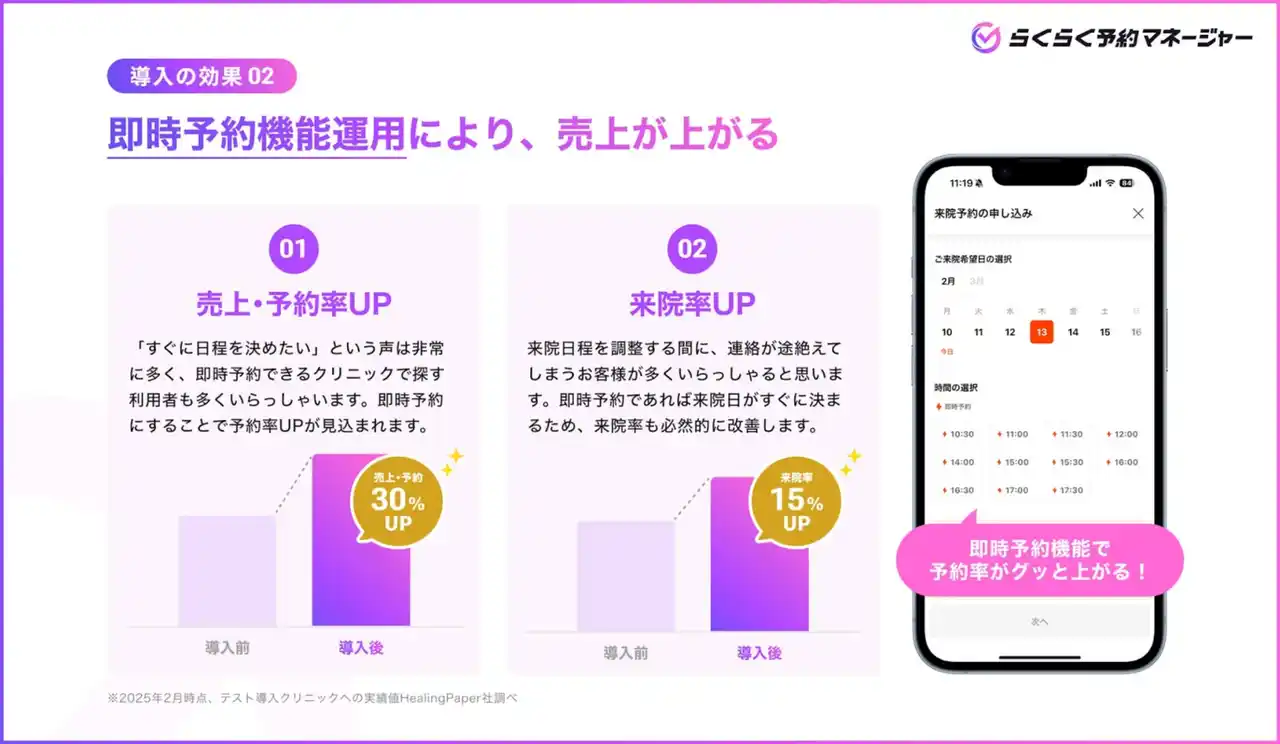 *3 2025年2月時点、らくらく予約マネージャー導入クリニックの実績平均値HealingPaper社調べ |