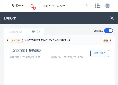 クリニック・連携機関ともにカルテに直接コメントを残せるため、情報伝達がより明確になります。例えば、薬局から処方内容に関する疑義照会を行いたい場合、処方欄にコメントとメンションを付けることで、医師に直接通知が届きます。これにより、電話やFAXの往復といった手間を大幅に削減し、迅速な対応を実現します。見逃しを防ぐ通知機能も万全です。 |