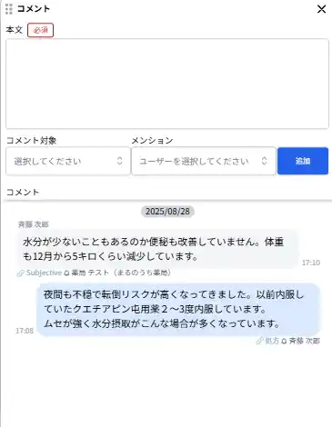 例えば、薬局の薬剤師が患者様から聞き取った副作用の状況や服薬アドヒアランスに関する情報を記録し、即座にクリニックへ共有できます。これにより、医師は次回の訪問診療に活かすなど、より多角的な視点での診療が可能になります。 |