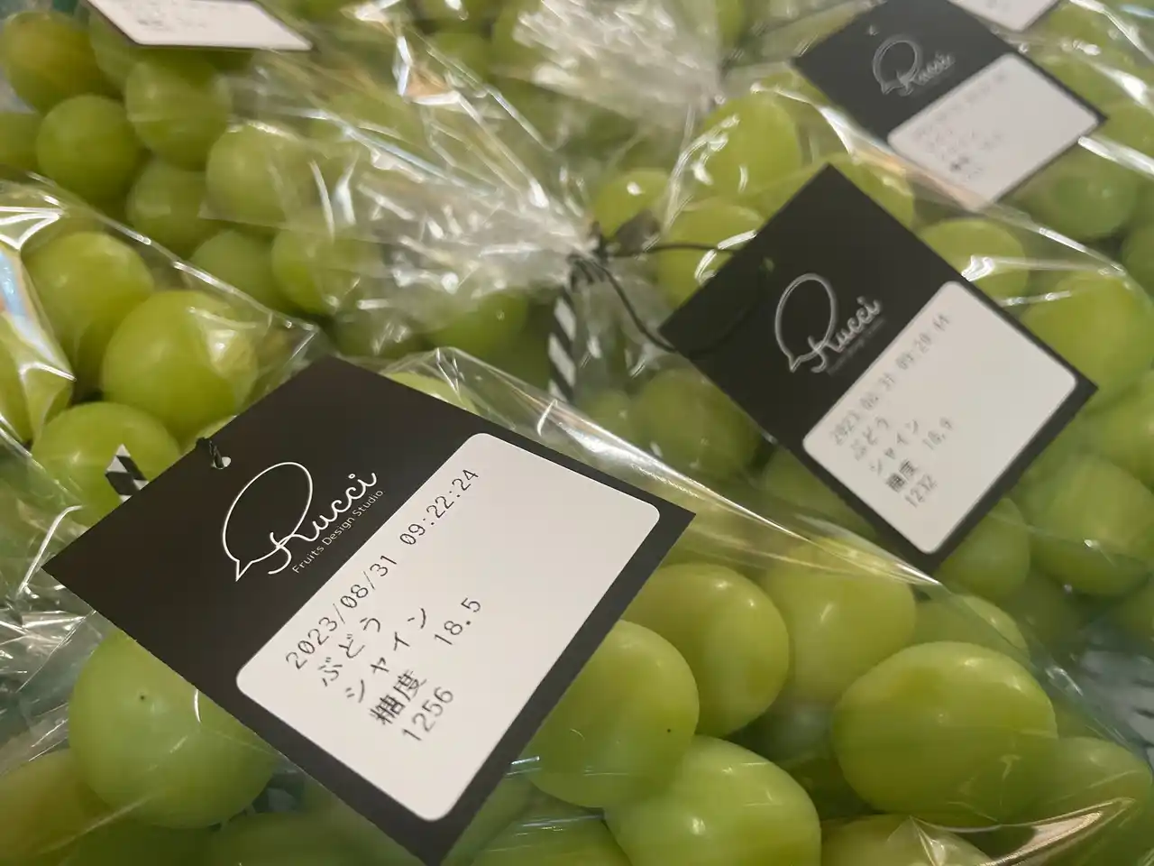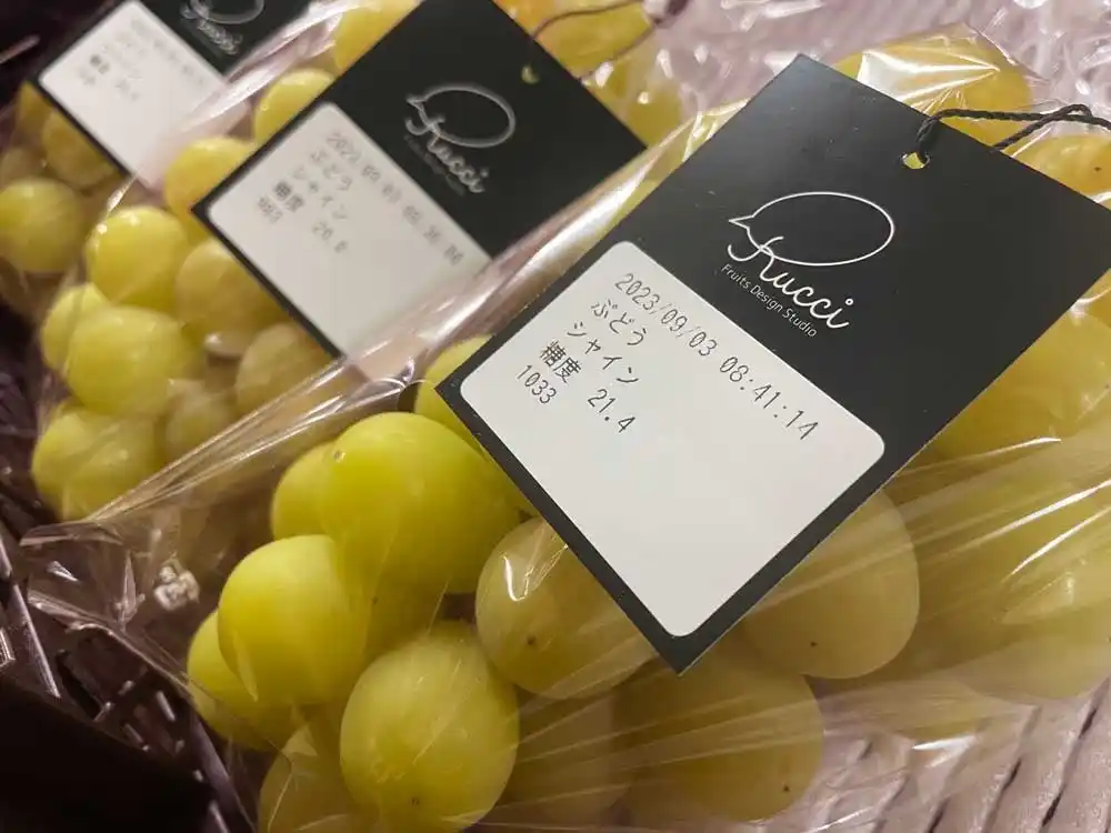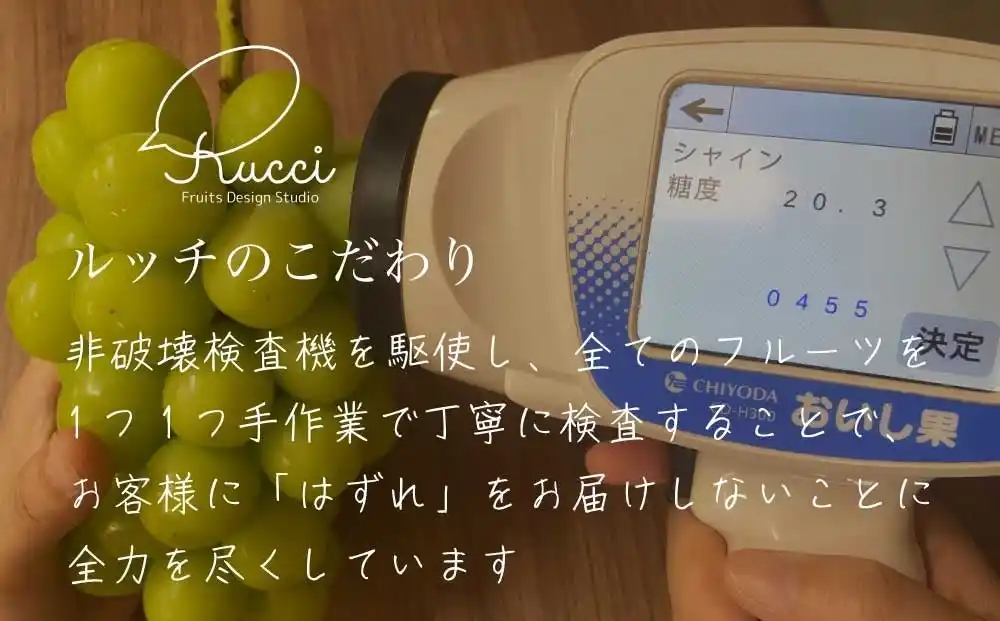 黄色いシャインマスカットに限らず、フルーツの美味しさに紐づく見た目の傾向はあれど絶対はありません。だから、緑のシャインマスカットも桃もキウイフルーツも、私達ルッチフルーツが取り扱うフルーツは全て非破壊検査機器を使って手作業で丹念に糖度検査を行い責任と自信を持ってお客様にお届けしています。その証に、ひとつひとつのフルーツに計測値、計測した日時、通し番号を記した糖度保証タグをお付けしております。 |
