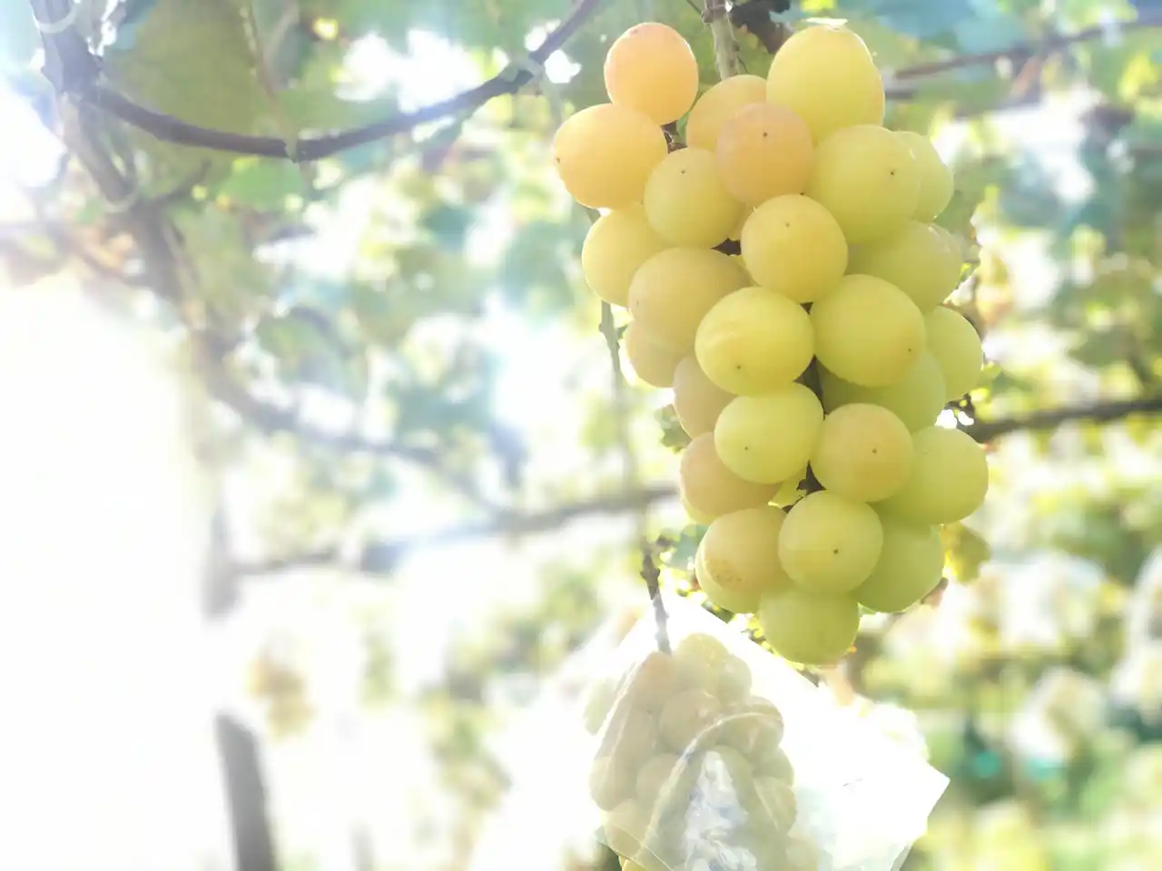 黄色く完熟したシャインマスカットは畑の日当たりの良い南面や枝の先端といった一部にしか出現しません。樹に成る実の多くを黄色く完熟させることは樹に無理をさせることとなり、樹勢(樹の元気)を一気に弱めてしまいます。成る実が黄色いのに味がない、最悪は枯れてしまうといった事になってしまいます。だから、一本の樹から収穫できる大人シャインマスカットはほんの少量で大変に貴重なのです。 |