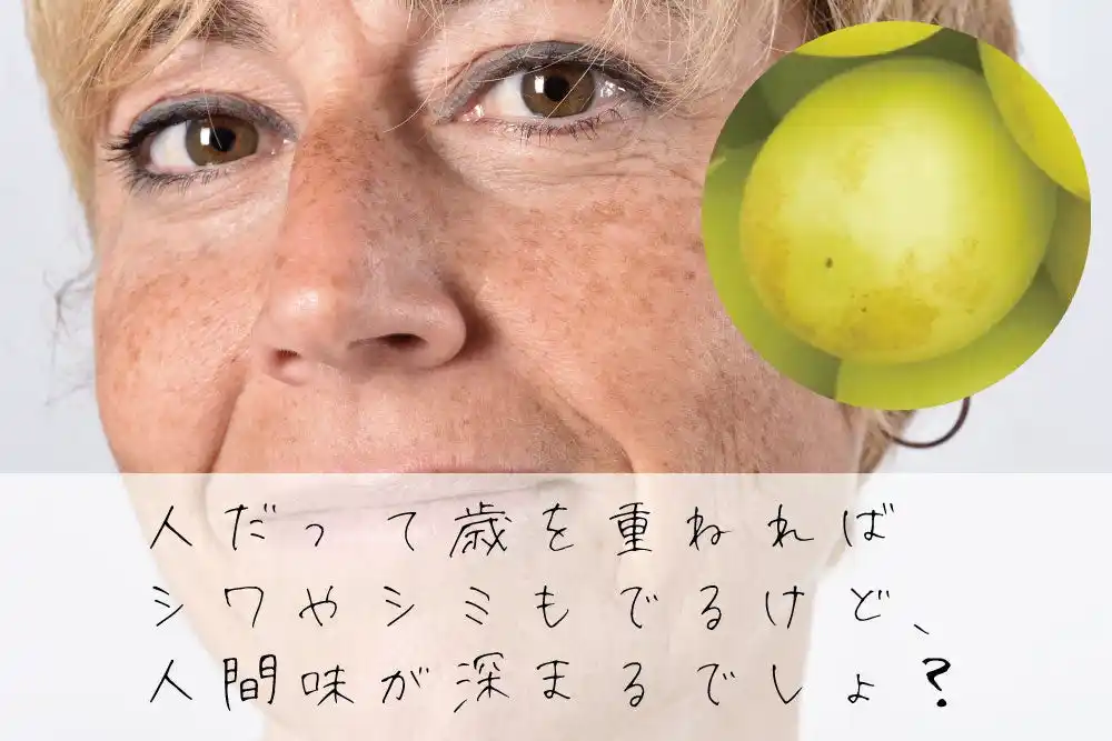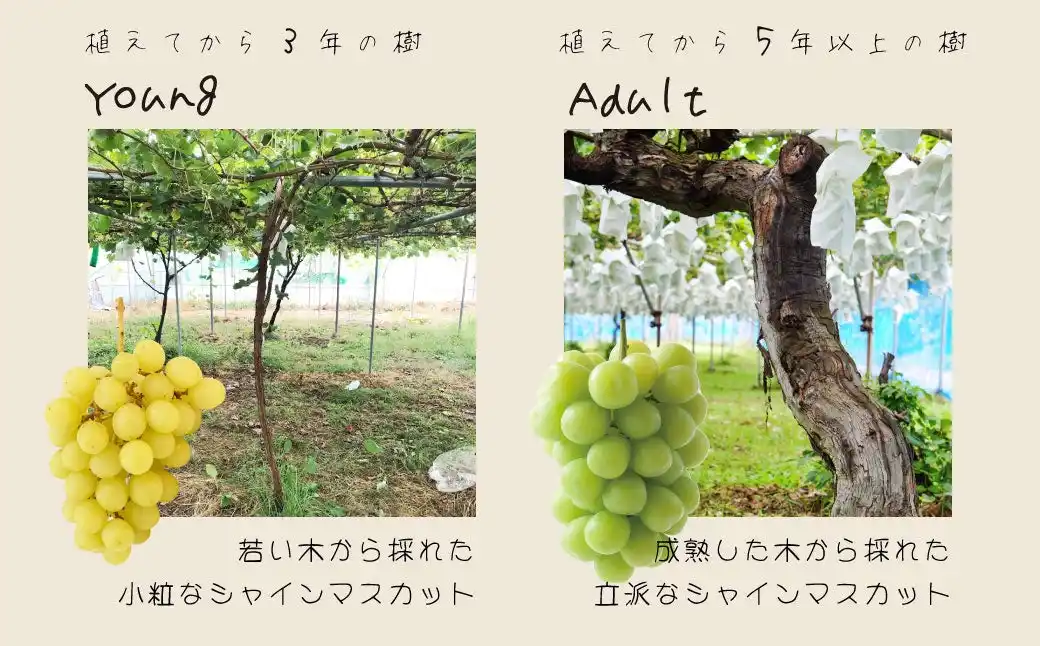 こんなに美味しいのに見た目だけで流通できないなんてもったいない!そこでわたしたちルッチフルーツは考えました。人間も歳を重ねれば、シワやシミだって出てくるけど人間味が深まります。シャインマスカットも樹上でじっくり熟成すれば味が深まるということに重ね、黄色く完熟したシャインマスカットを「大人シャインマスカット」(商標登録済)と名付けさせていただきました! |