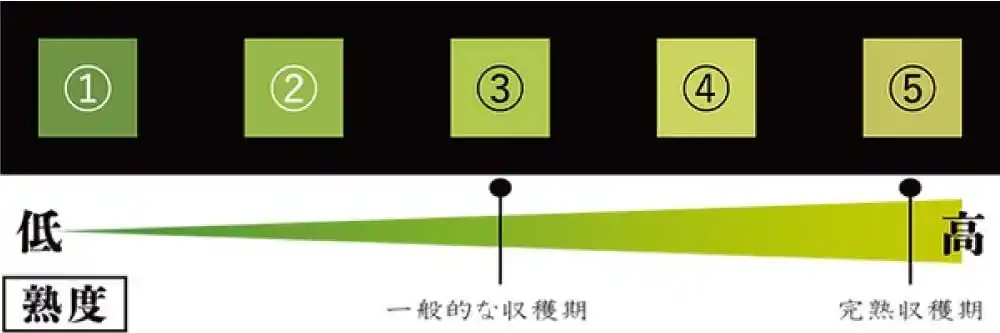 一般的には下記のようなカラーチャート(収穫適期判別カラーチャート/山梨県総合理工学研究機構)などにより、3.の色を目安に収穫が行われます。これを超えた4.、5.になると突如として「カスリ」と呼ばれるシミが発現しやすくなり、市場でお客様に手にとっていただくには美味しさは当然のことながら、見栄えも重要視されるためにこれまで敬遠されてきました。ですから農家も3.の色を目安に収穫しますし、また完熟がゆえに出荷管理も通常より難しいこともあり一般的に市場に出回らないのです。 |