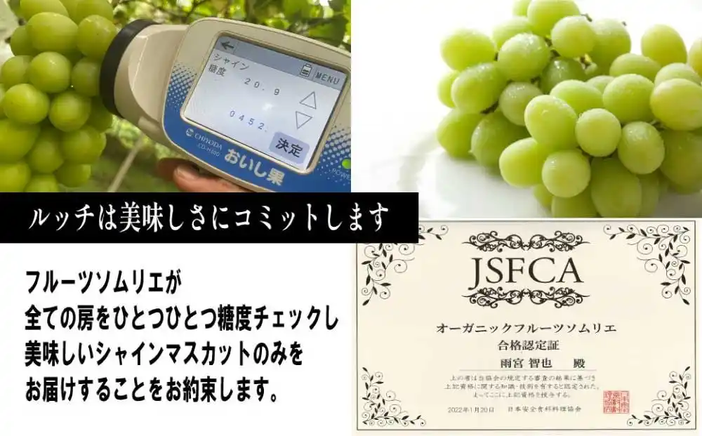大人・こどもシャインマスカットともに糖度20度以上を保証 |