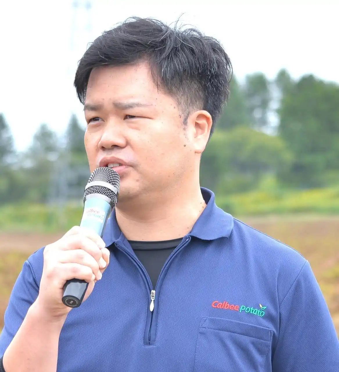 今年は「カルビーポテトチップス」発売50周年を記念し、Calbee 「Fan With! Project」の一環としてカルビーと初めて共催で行いました。イベントでは初めにカルビーポテト社長の田崎、芽室支所長の田岡、そして契約生産者であり芽室町加工馬鈴しょ生産組合の大谷組合長の3名よりご挨拶を行いました。 |
