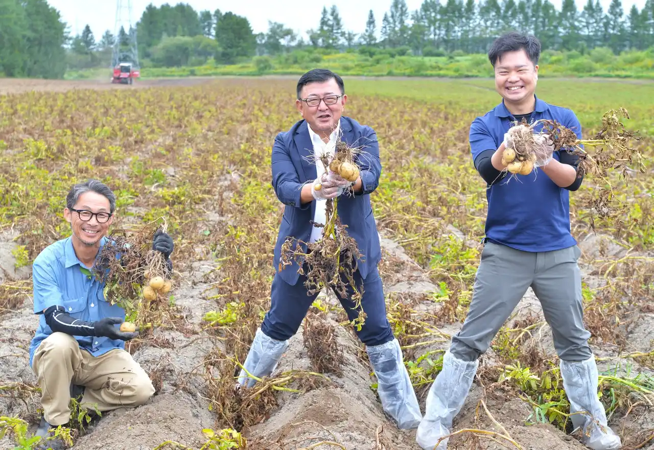 カルビーポテト株式会社(本社:北海道帯広市、代表取締役社長:田崎 一也)とカルビー株式会社(本社:東京都千代田区、代表取締役社長兼CEO:江原 信)は、2025年8月29日(金)に北海道河西郡芽室町の畑で『Calbee Fan With! Project×カルビーポテト じゃがいも収穫ファンミーティングin北海道』を開催しました。 |
