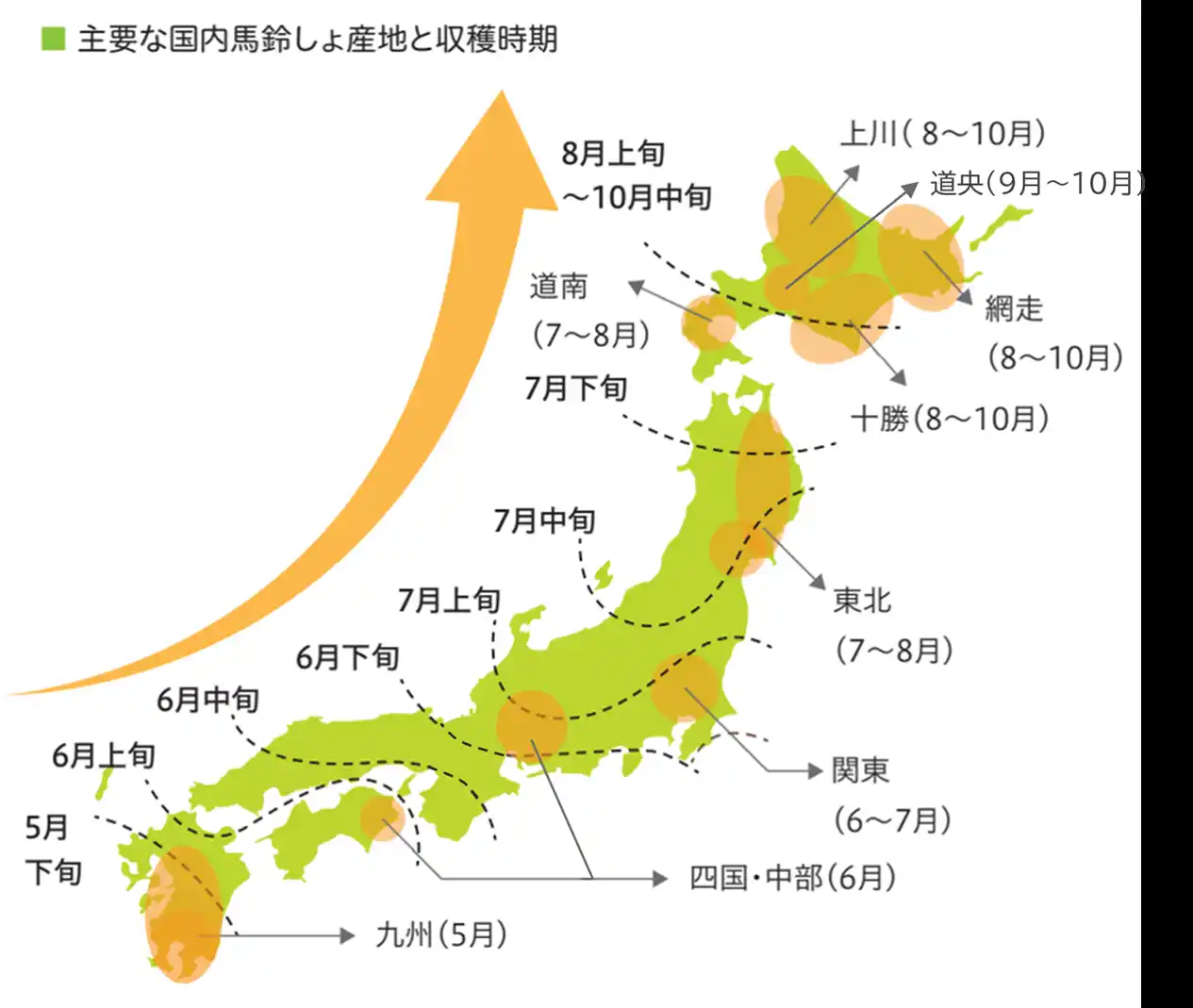じゃがいもは、地域によって収穫時期が異なります。南の地域ほど早く、梅雨前線や桜前線のように“じゃがいも収穫前線”が北上していきます。 |