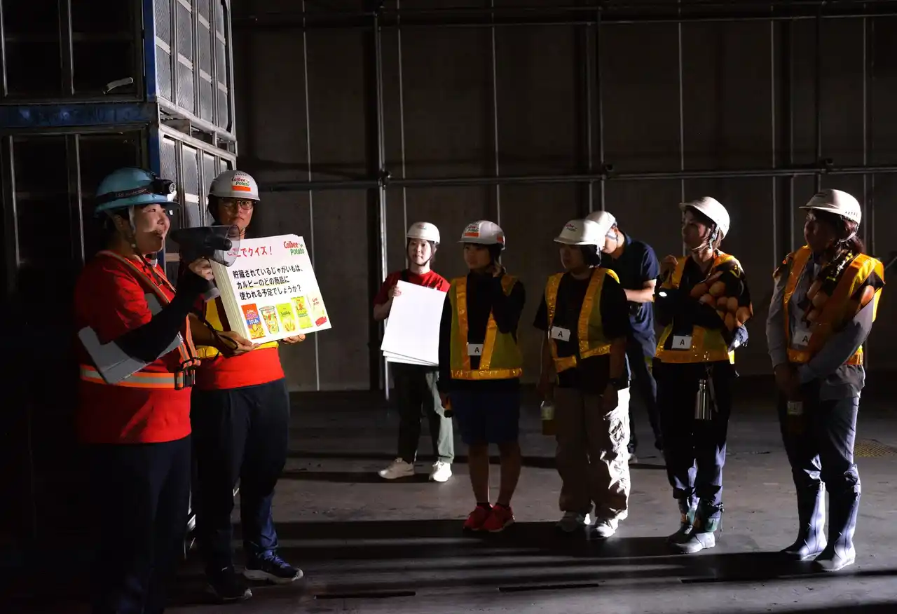 2025年度のCalbee『Fan With! Project』の第6回は、8月29日(金)に北海道河西郡芽室町の契約生産者の畑および貯蔵庫で行いました。今年9月に「カルビーポテトチップス」が発売50周年を迎えるのを前に、ポテトチップスの原料じゃがいもの一大生産地である北海道・十勝で開催。収穫が最盛期を迎えるタイミングで「今年も無事に収穫が終えられることを願いたい」と、グループ会社で原料調達を担うカルビーポテトと共催で行いました。当日はじゃがいもの収穫やじゃがいも貯蔵庫の見学、さらに収穫したじゃがいもを使ったポテトチップスの試食などをファン約30名さまが楽しみました。 |
