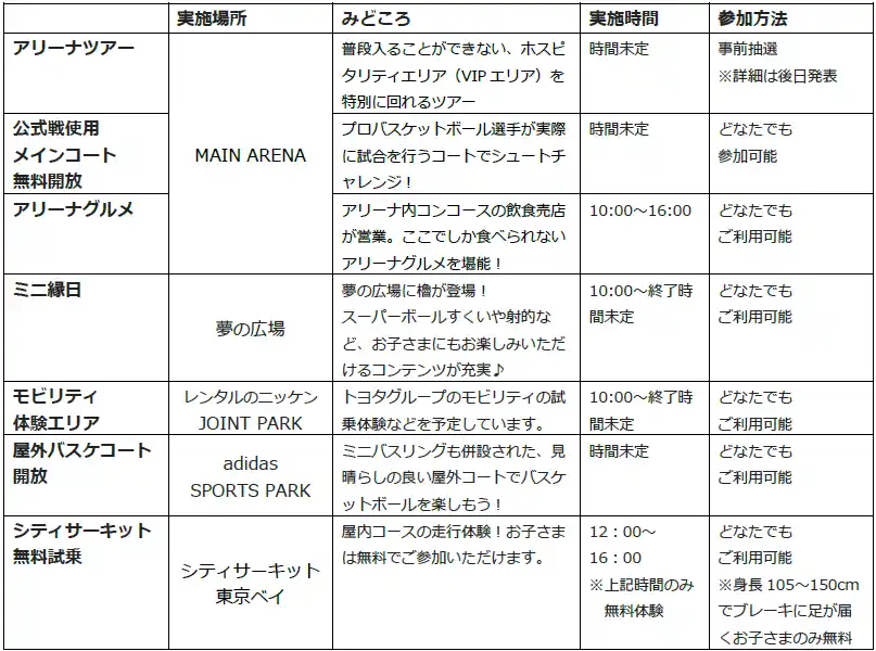 なお、施設近隣にある「シティサーキット東京ベイ」、「夢の広場」などでも、ARENA DAYに合わせたイベントを実施予定です。 |