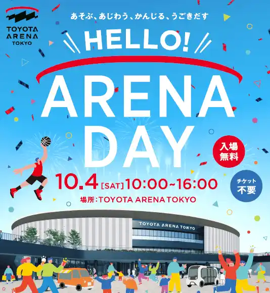 トヨタアルバルク東京株式会社(本社:東京都江東区、代表取締役社長:林 邦彦)は、2025年10月3日(金)開業の新アリーナ「TOYOTA ARENA TOKYO」の開業を記念して、10月3日(金)から26日(日)の期間を「OPENING 4WEEKS」と称し、期間中に実施するイベントとのコラボレーション企画や近隣施設との連携企画を実施します。さらに、OPENING 4WEEKS期間中の10月4日(土)には、アリーナを無料で楽しむことのできる体感イベント「HELLO! ARENA DAY」を実施いたします。 |