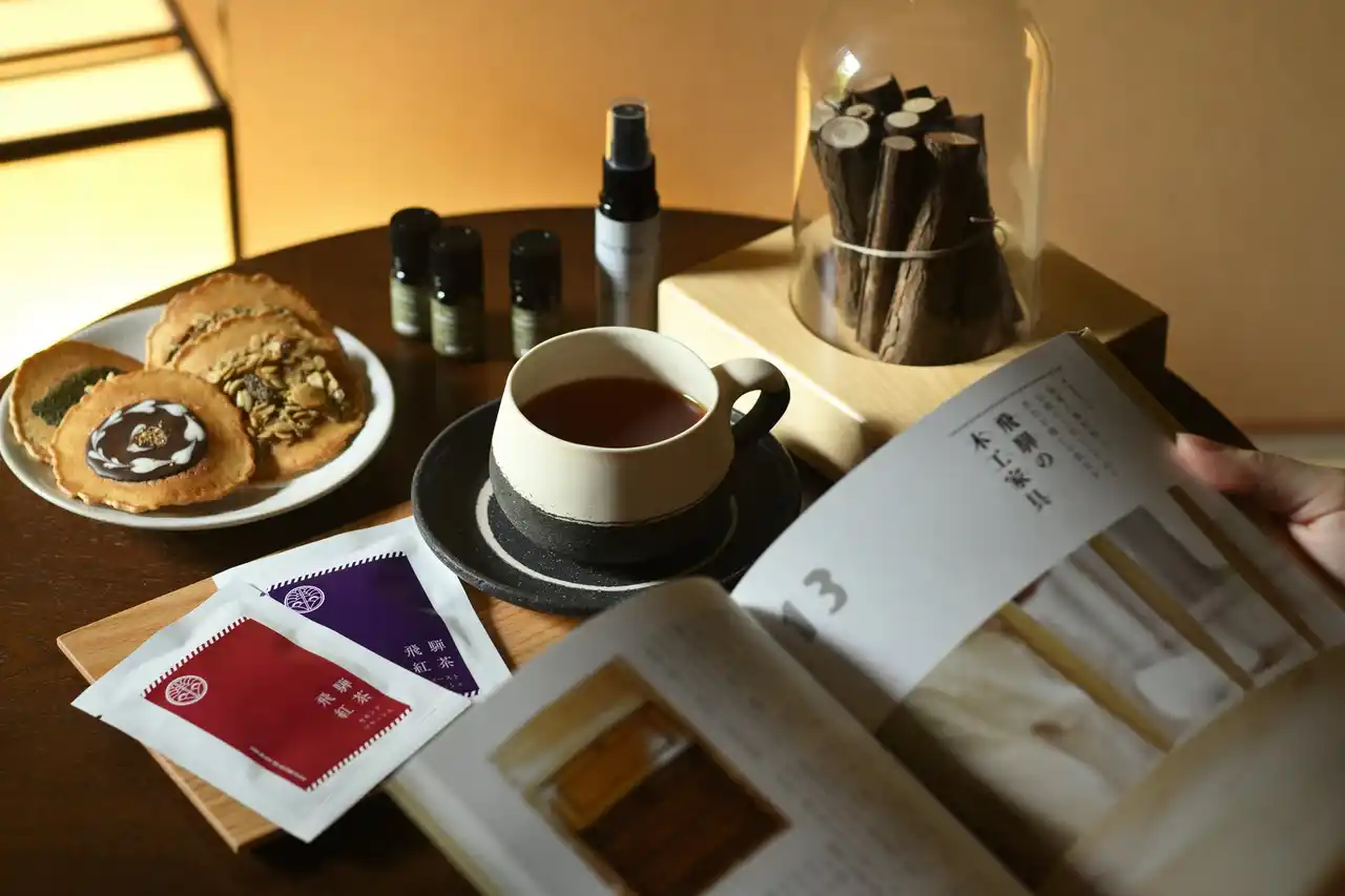 | お部屋にチェックイン後、まろ氏監修の「ひとり温泉宿のしおり」をお渡しします。おすすめの滞在スケジュールや、ひとりだからこそ楽しめるポイントなど、はじめてのひとり温泉宿を楽しむための情報が満載です。一緒に、おひとりさま時間を最高のものにしてほしい、という想いから選定した「おひとりさまウェルカムティー」もご用意するので、ほっと一息つきながら、緊張した気持ちをほぐすことができます。また、ひとり温泉宿に寄り添う存在として、特製のお守りもご用意。ひとり温泉宿の不安を解消しつつ、これからの滞在に期待を膨らませる時間となります。 | ||||||||||||||