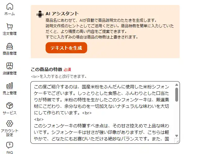 ケーキ・スイーツ専門通販サイト「Cake.jp(ケーキジェーピー)」を運営する株式会社Cake.jp(本社:東京都新宿区、代表取締役:高橋 優貴)は、ケーキ店のEC運営を効率化する「AI商品説明文作成機能」をリリースいたしました。本機能により、出店店舗は商品紹介文の作成を短時間で行うことができ、誰でもスムーズに商品ページを公開できるようになります。